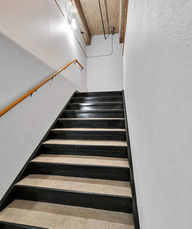 Once entering the condo, there is a flight of stairs that leads to the bedroom, bath, kitchen and living area. The laundry room is downstairs.