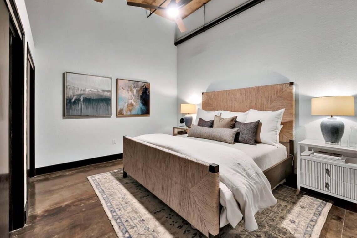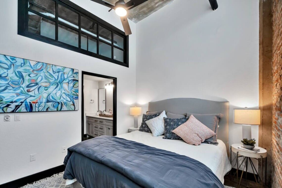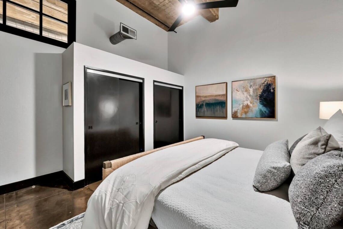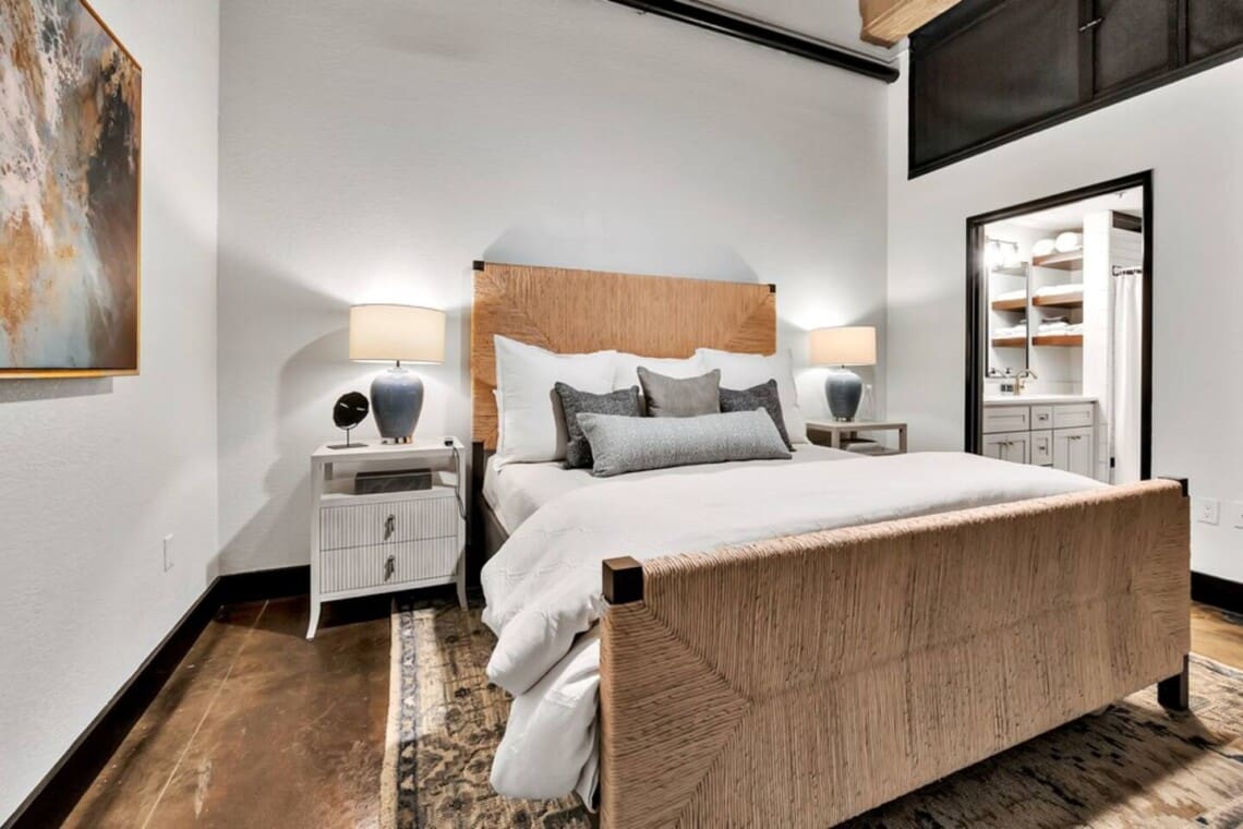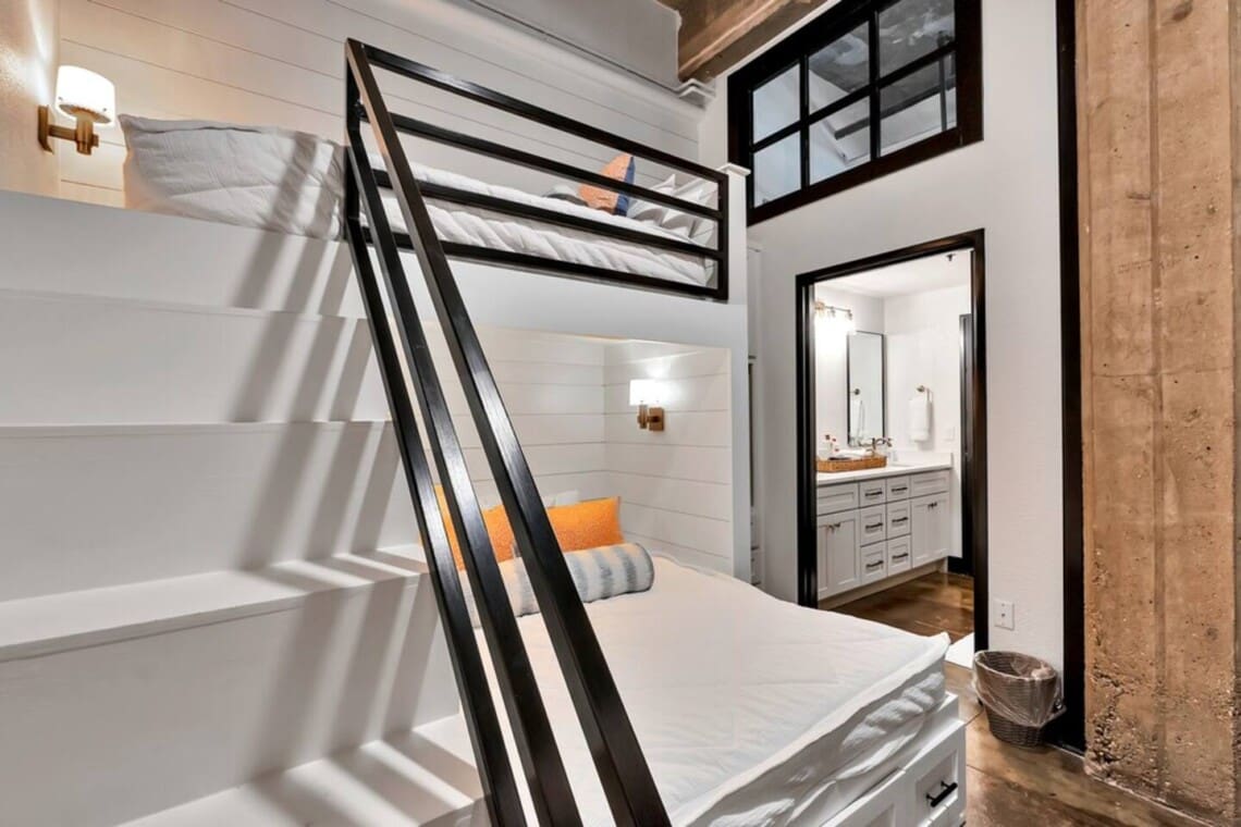 This industrial yet cozy condo features 3 bedrooms, 2 bathrooms, and 4 beds sleeping up to 7 guests. Each bedroom is stylishly decorated, with comfortable linens and thoughtful details throughout. Two of the beds feature adjustable heads, including a Tempur-Pedic and a Beautyrest Black, for added comfort. The bathrooms are spacious and stocked with personal amenities.