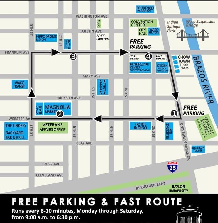 The City of Waco Provides a Silo District Trolley – more details can be seen on the Waco Transit Page.