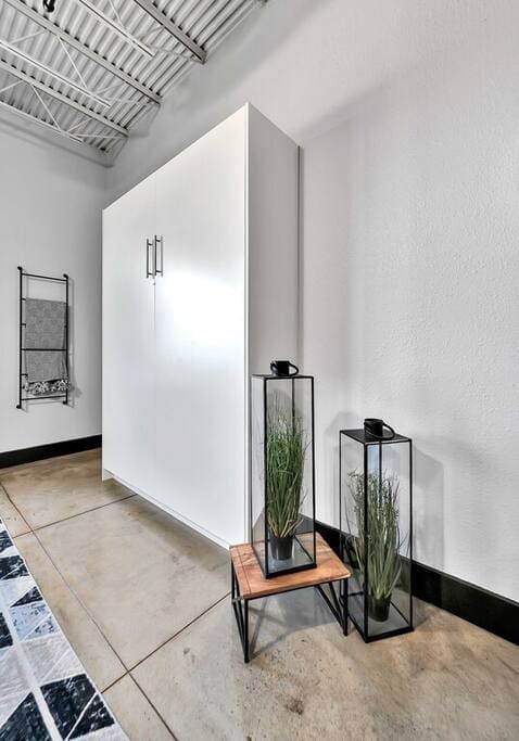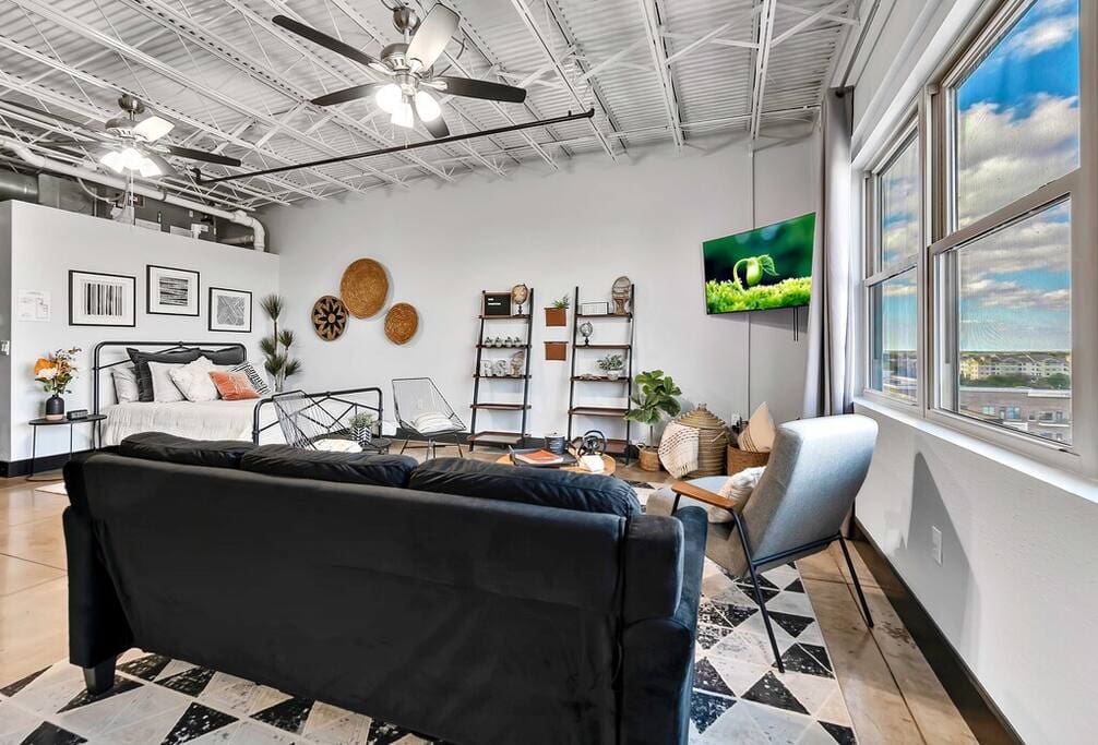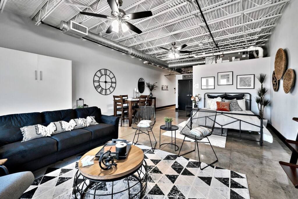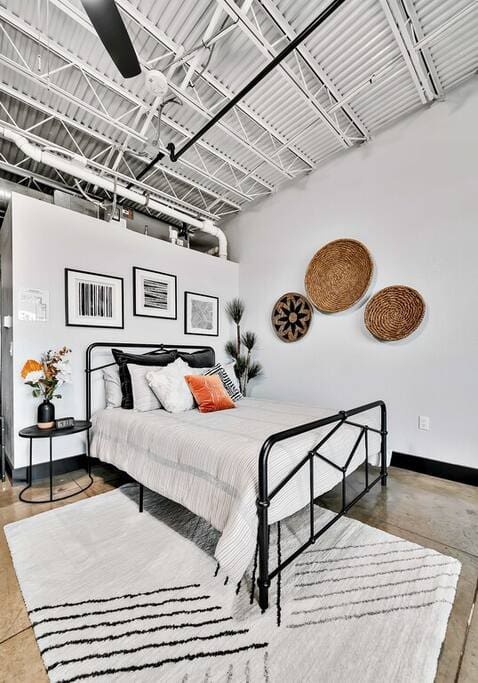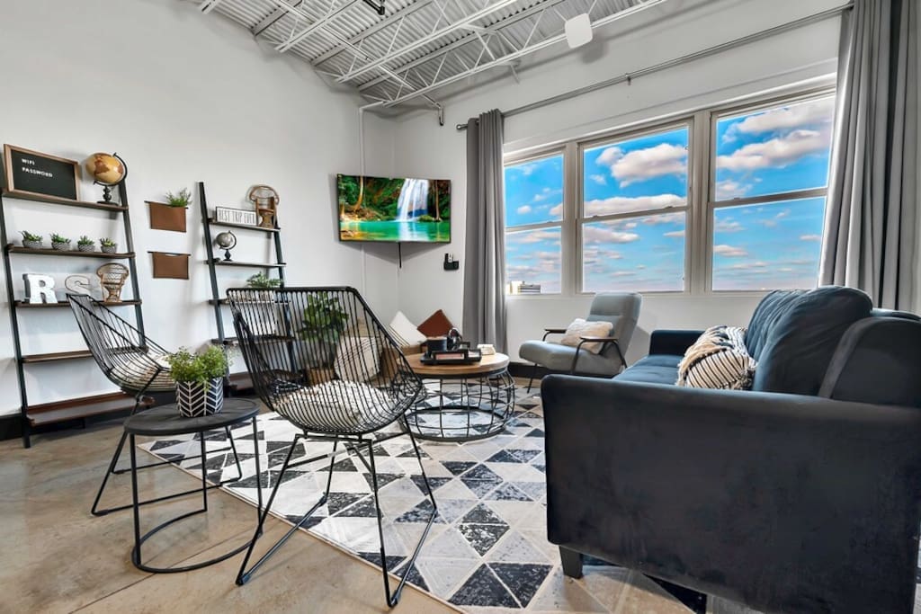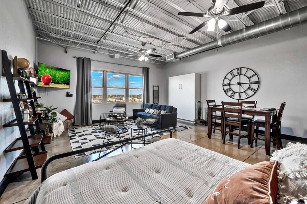Boho Bungalow is located on the 5th floor of the Behrens Lofts in downtown Waco. Built in 1913 for the Behrens Drug Company, this fireproof concrete building survived the devastation of the 1953 Waco tornado & is now one of Waco’s most luxury condo establishments. Truly unique in preserving all the industrial charm & characteristics of the past, this property flawlessly blends old factory details with modern amenities & design concepts.