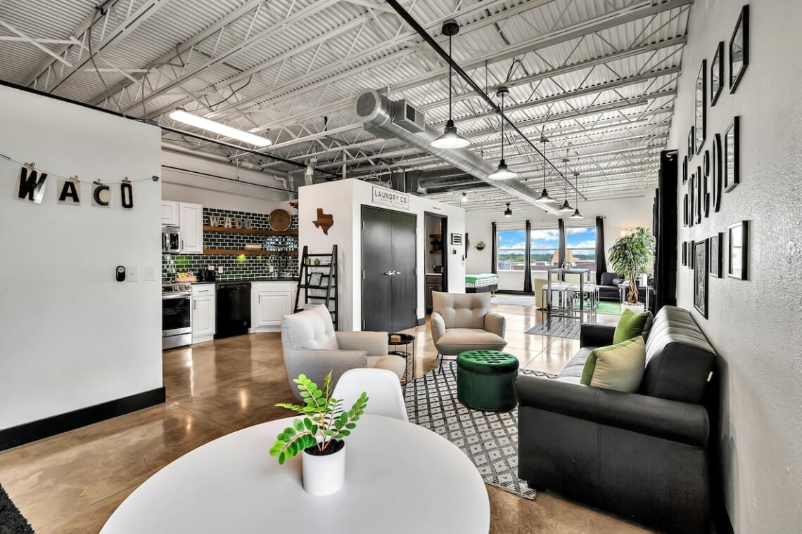 Large, panoramic windows flood the space with natural light and showcase sweeping views of downtown Waco, making it one of the loft’s standout features. Inside, you’ll find an open floor plan, dining space for four, a cozy breakfast nook (or workspace), and plenty of comfortable seating for relaxing and reconnecting.