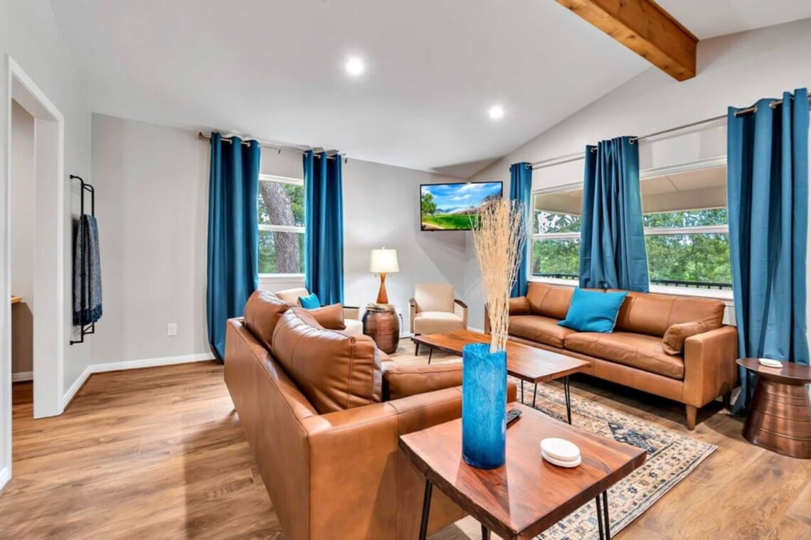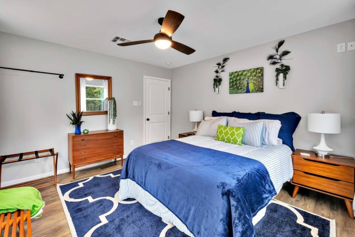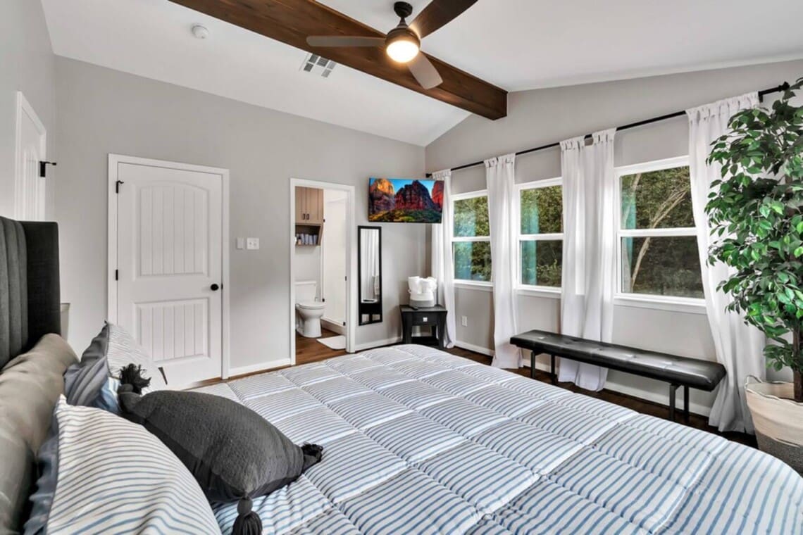 The queen bed is adjustable and very comfortable. Both beds have Malouf bedding and pillows. The lamps besides the beds have USB ports for charging your phone. We also have a Cornhole game set up and are adding washers and other outdoor games soon.
