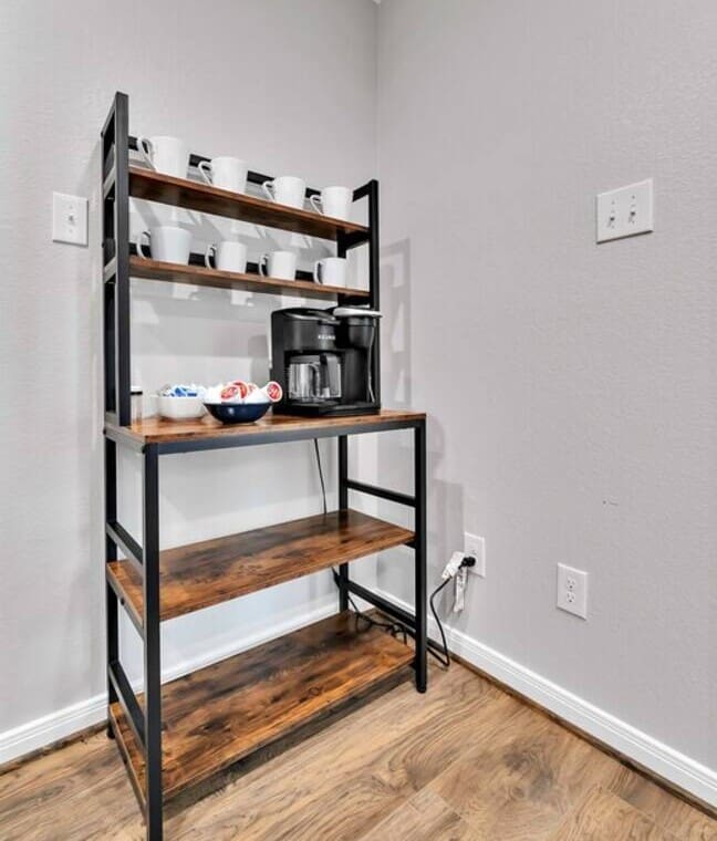 We provide a Keurig Duo as well as creamer, sweeteners and pods.