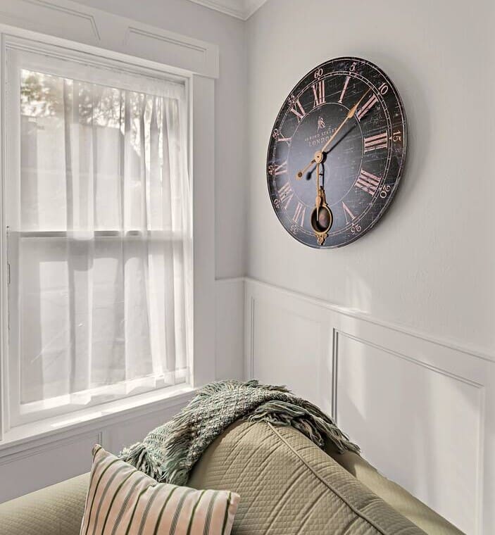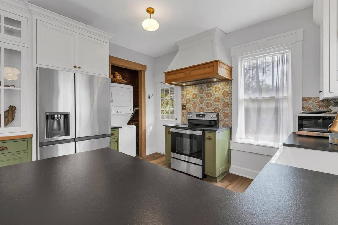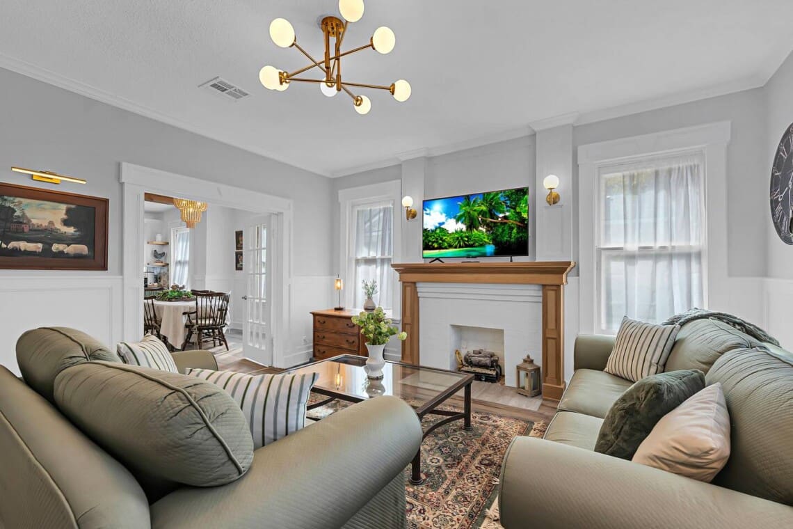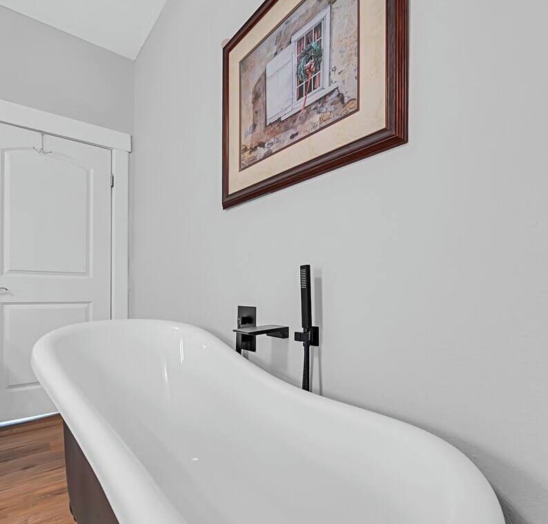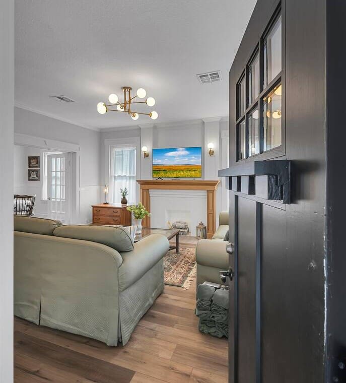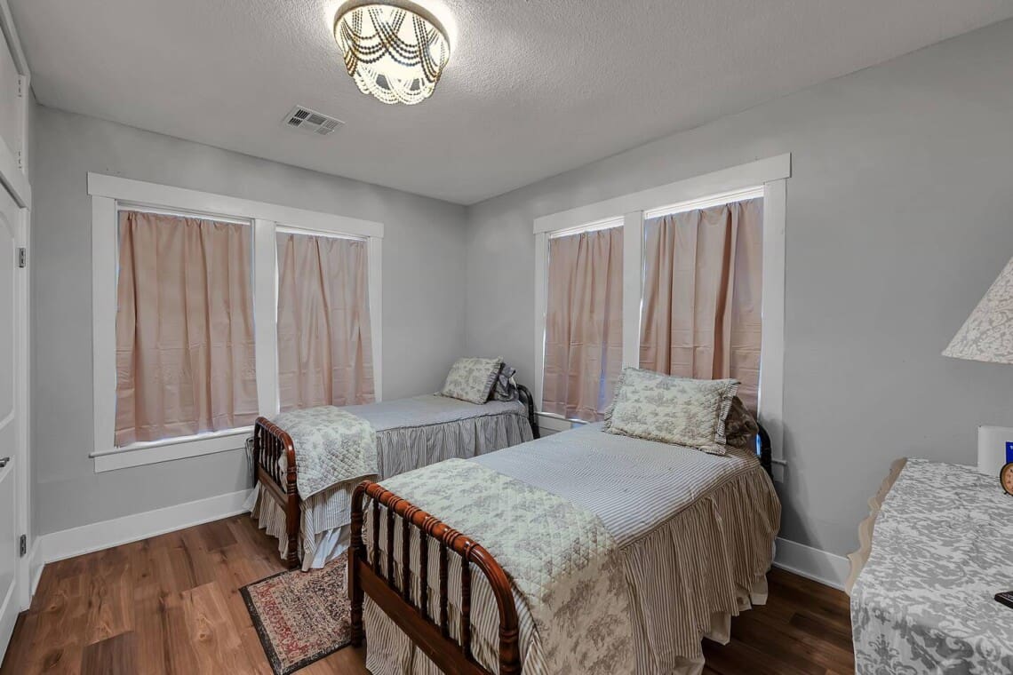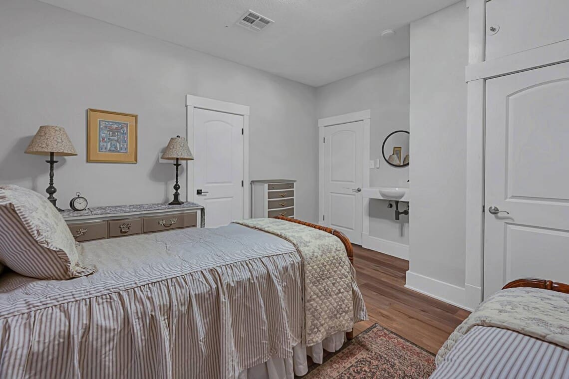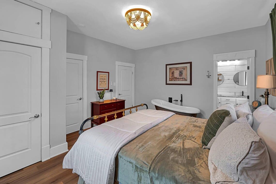 Inside, you’ll find vintage details like a clawfoot soaking tub, paired with thoughtful comforts throughout. The primary bedroom offers a cozy escape with the tub just steps away, while the second bedroom includes twin beds and a private sink. The Jack-and-Jill bathroom features dual vanities and an oversized walk-in shower, offering plenty of space to start and end your day with ease.