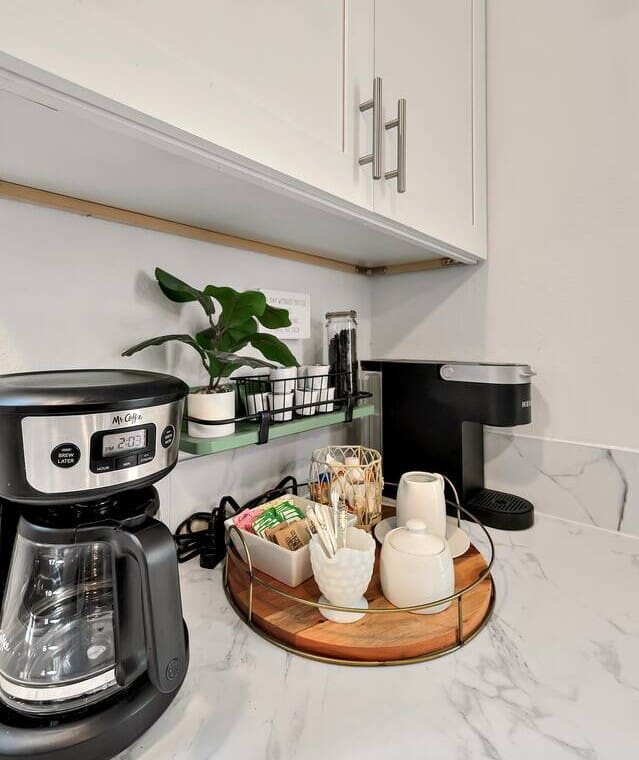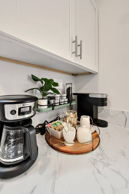 Both a conventional & Keurig coffee maker, coffee grinder & coffee supplies provided.