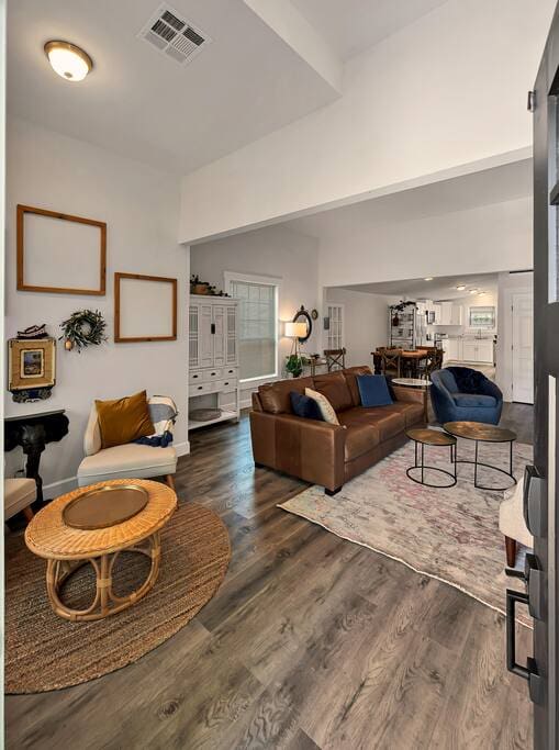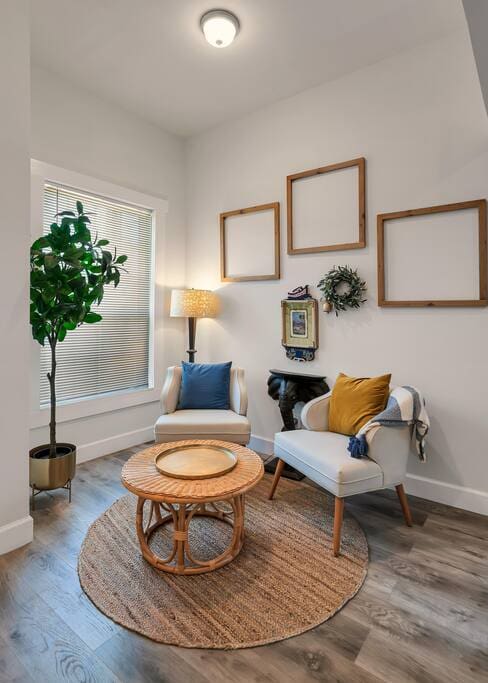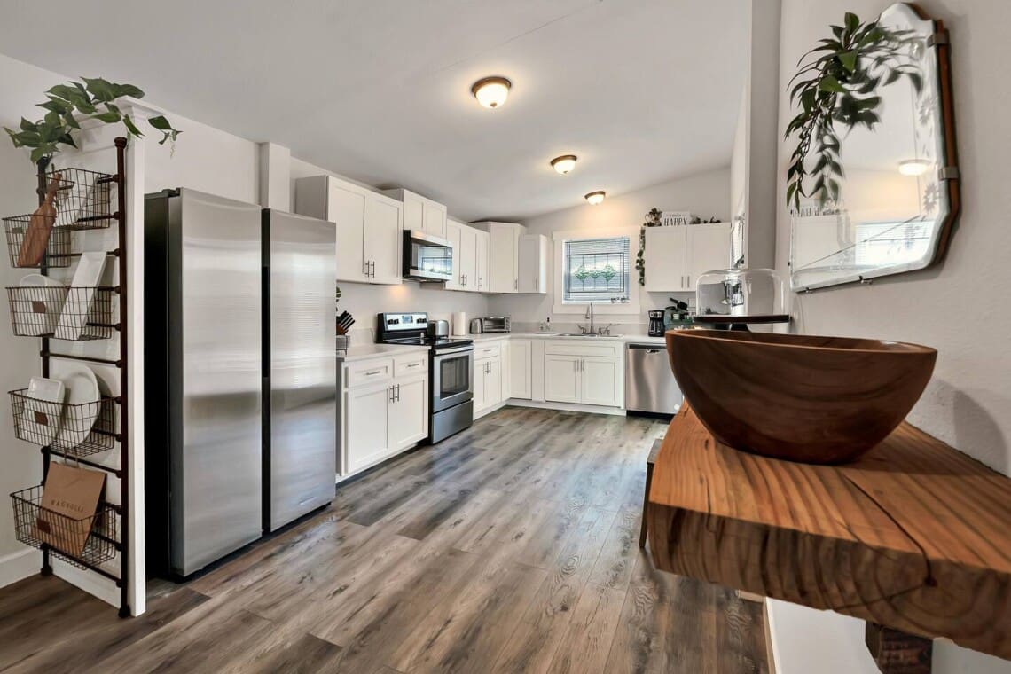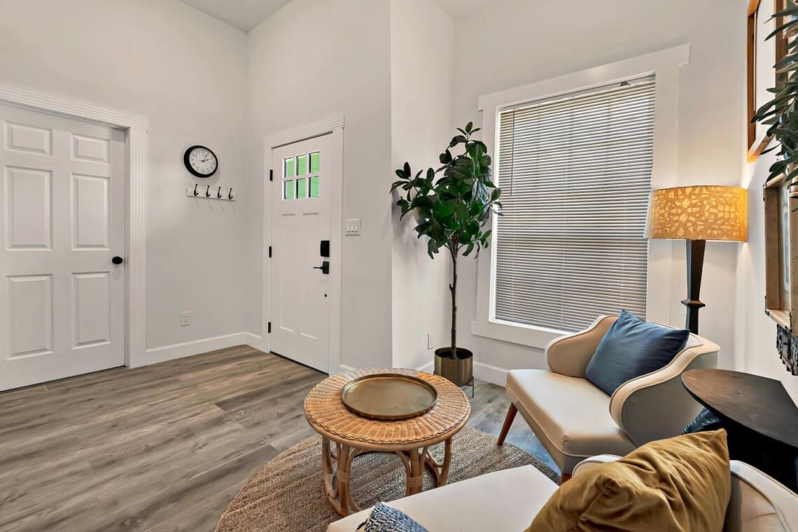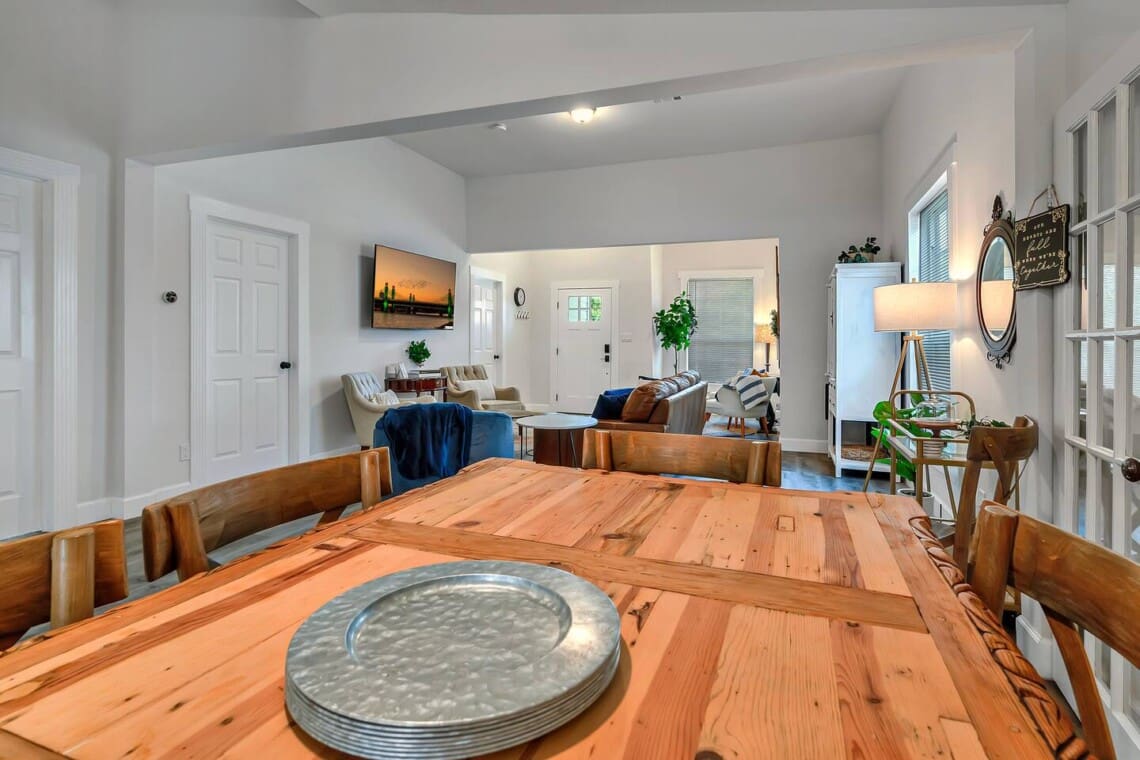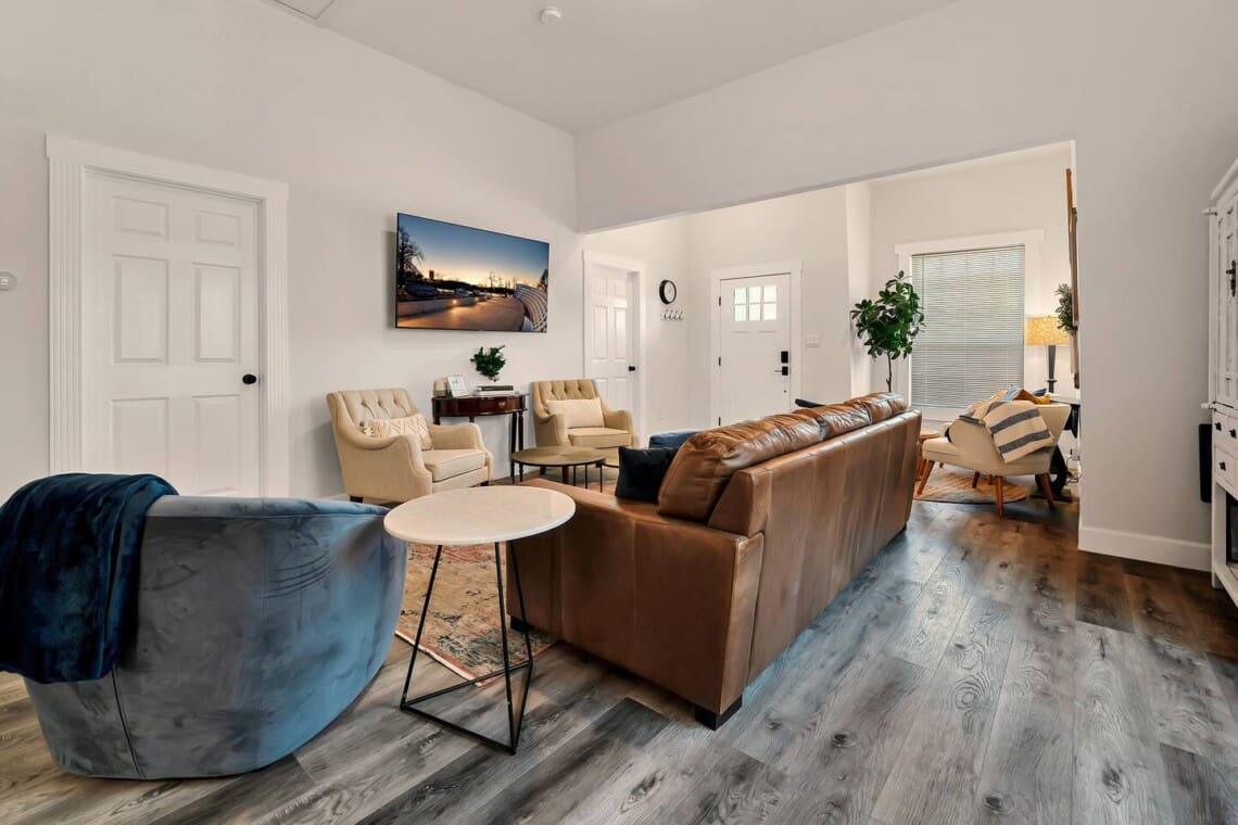The open-concept layout includes a fully stocked kitchen, a handcrafted dining table with plenty of seating, and a cozy living room with ample seating and a 70” smart TV. The primary bedroom also includes a 40” Roku TV for winding down after a full day in the city.