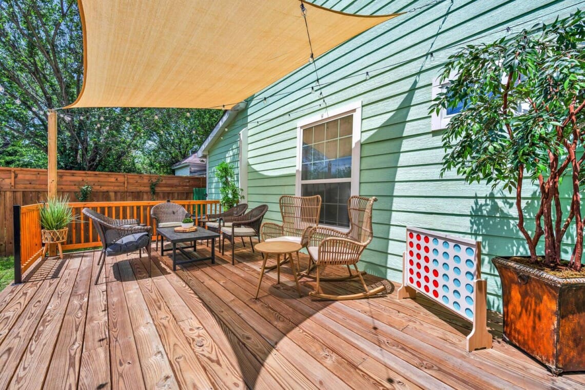 Outside, unwind in the large, fully fenced backyard, complete with private gated parking and a brand-new deck outfitted with rocking chairs, shade sails, and outdoor seating—perfect for a peaceful morning coffee or an evening under the stars.
