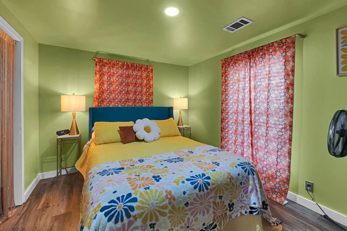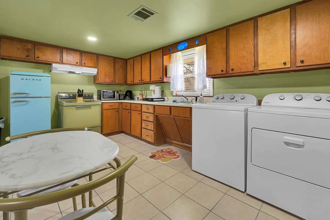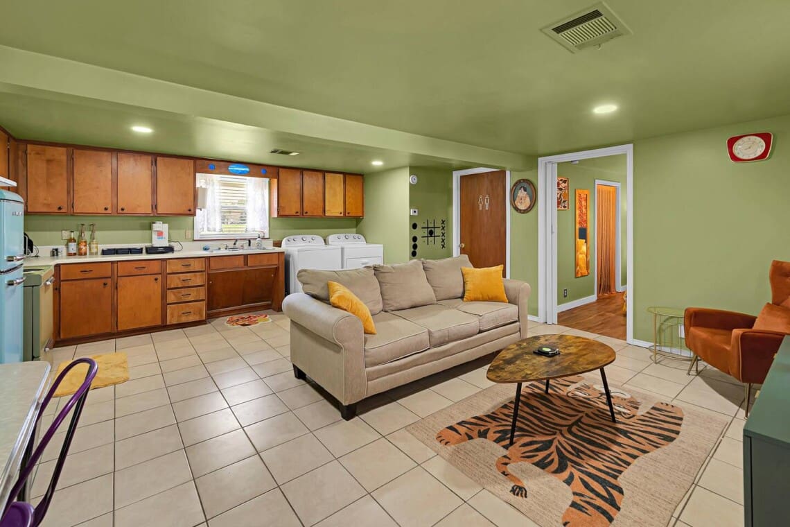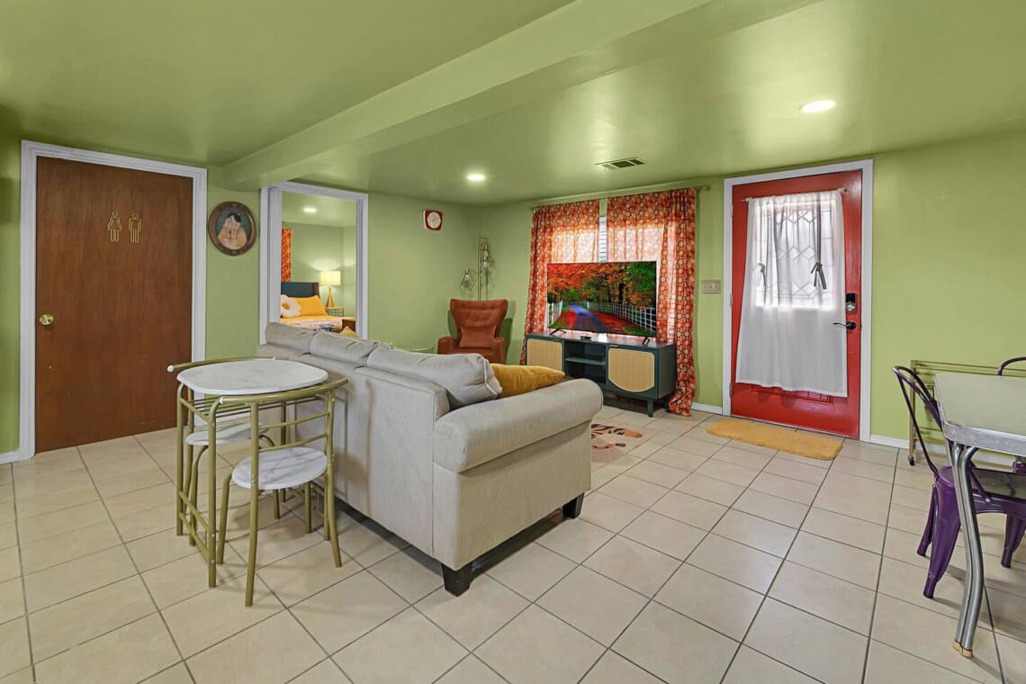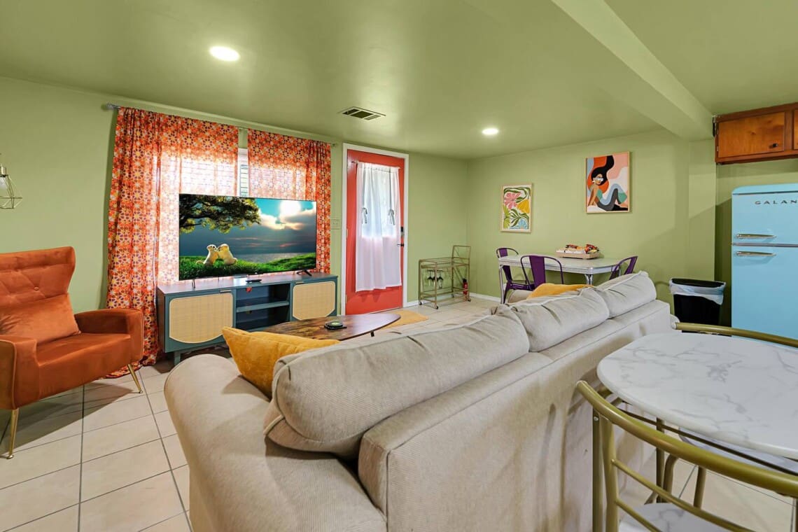 The spacious main house sleeps 10, with three comfortable bedrooms, two bathrooms, a full kitchen, and open living areas perfect for gathering or spreading out. A dedicated workspace makes it easy to stay connected if needed. Just steps away, the retro-style tiny guest house adds extra charm, sleeping up to 4 more guests with its own kitchen, living area, and full bath.