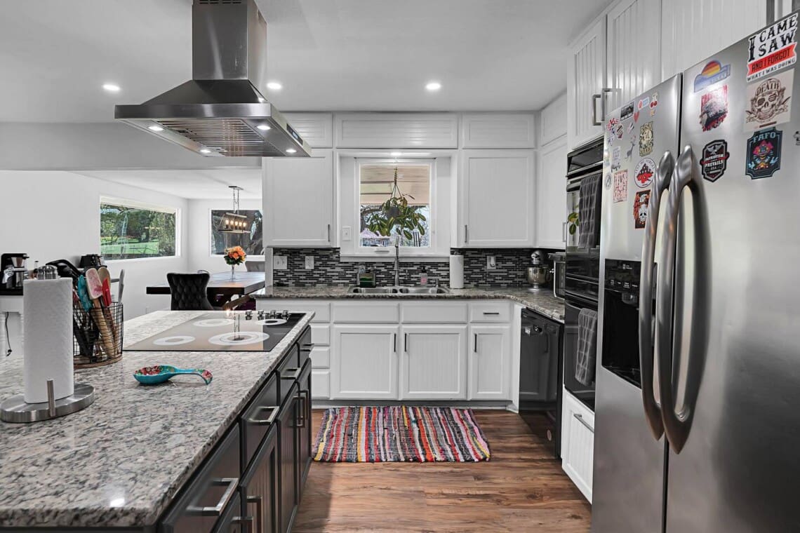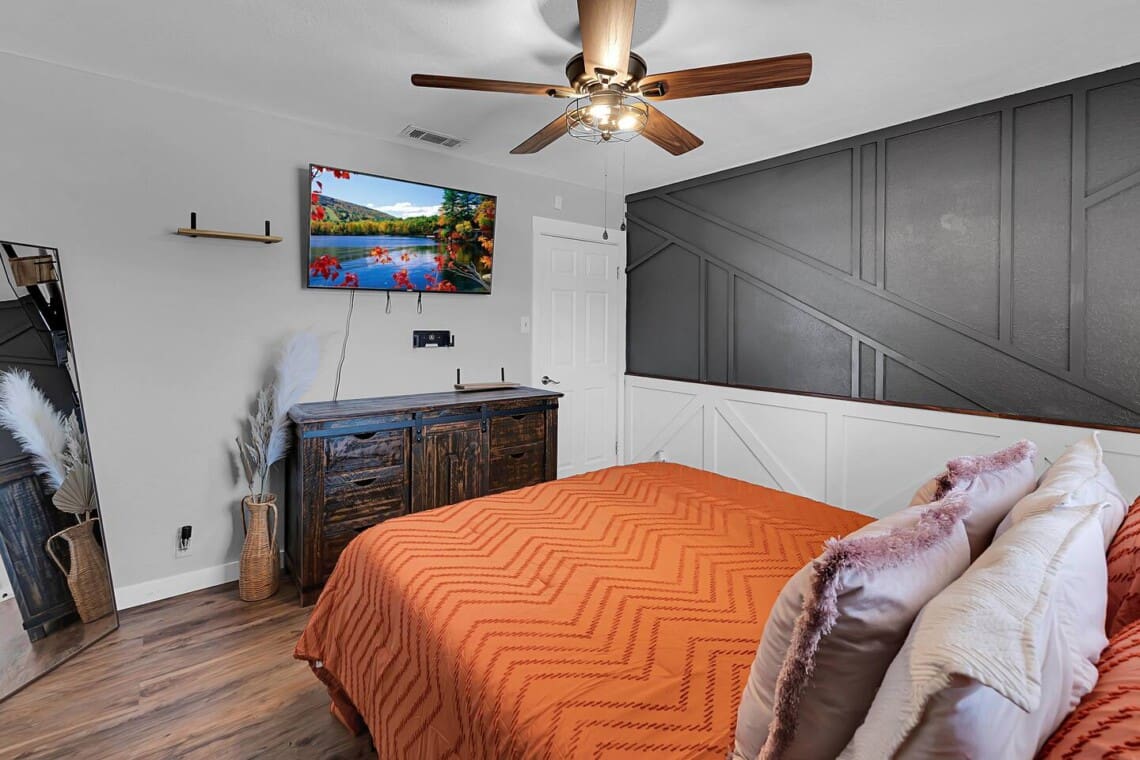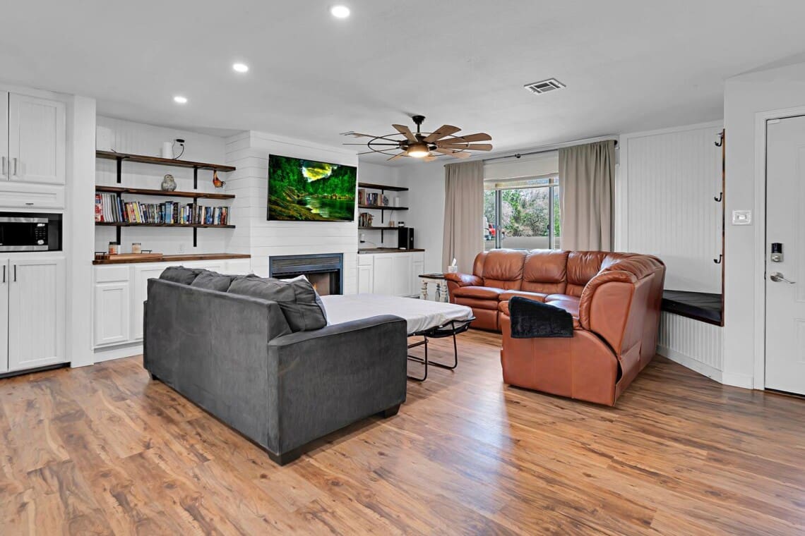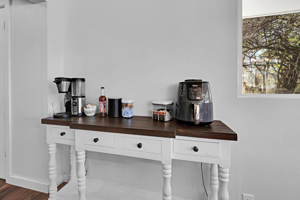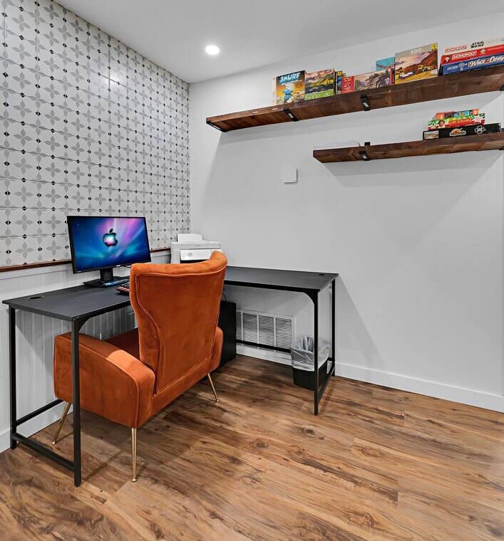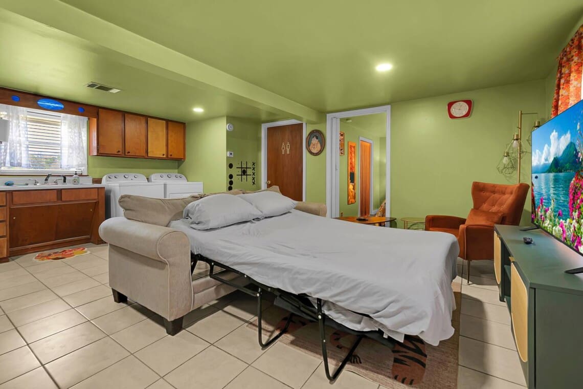 The spacious main house sleeps 10, with three comfortable bedrooms, two bathrooms, a full kitchen, and open living areas perfect for gathering or spreading out. A dedicated workspace makes it easy to stay connected if needed. Just steps away, the retro-style tiny guest house adds extra charm, sleeping up to 4 more guests with its own kitchen, living area, and full bath.