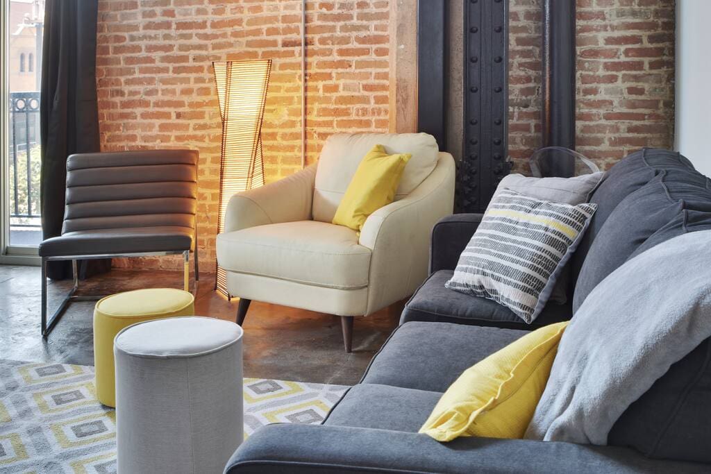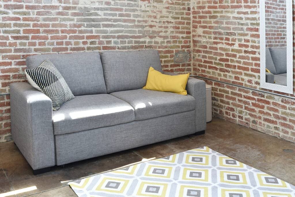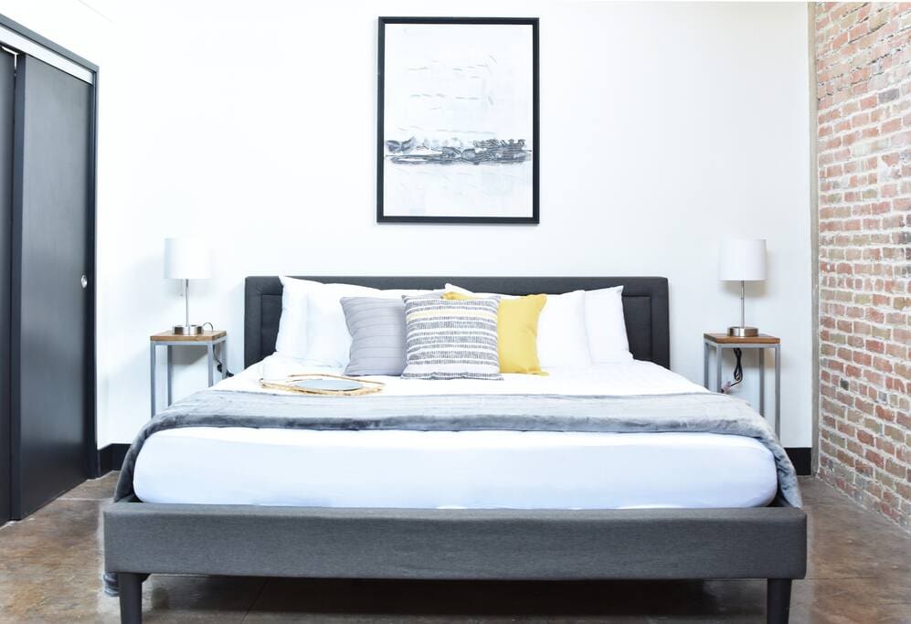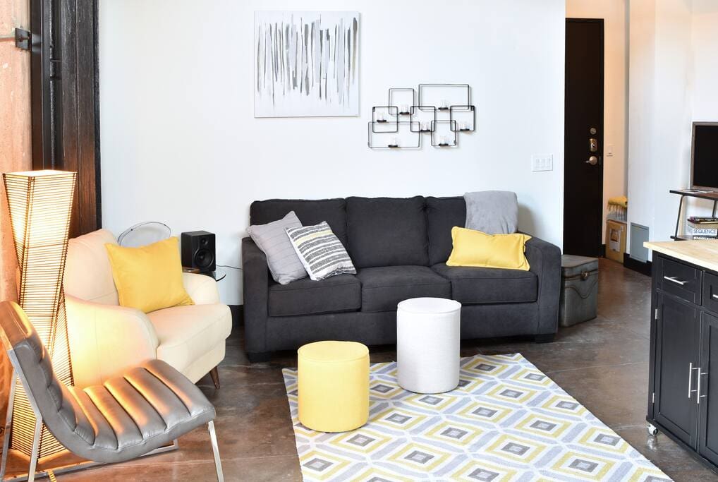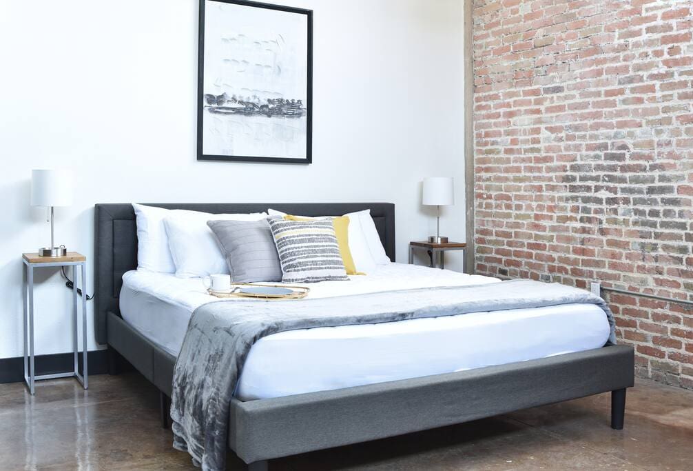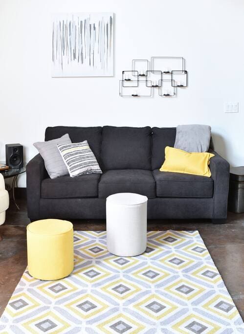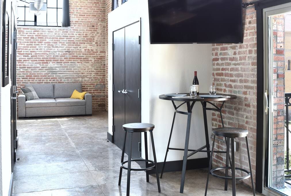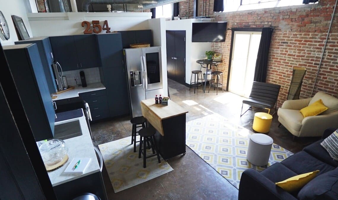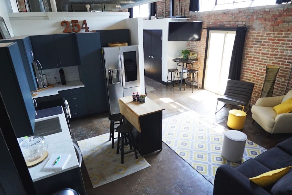 Authentic warehouse windows fill the entire space in natural light, making it a great place to relax or get ready for your visit to Magnolia, or game day at McLane Stadium. The bedroom boasts a king-sized bed and a fold out sofa (perfect for kids or really short adults!), and there is also a queen-sized blow-up bed with an additional topper for use in the living room. The loft has a full size washer and dryer, and a fully-equipped kitchen, complete with coffee and tea.