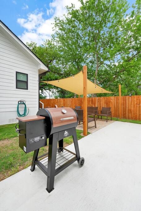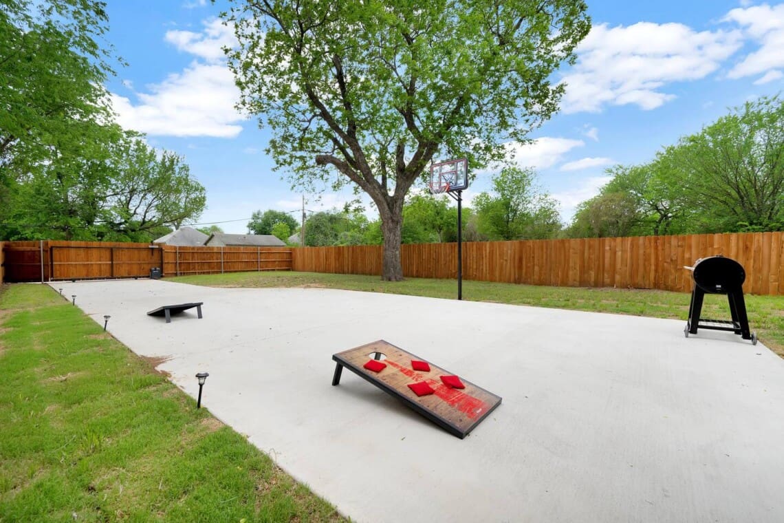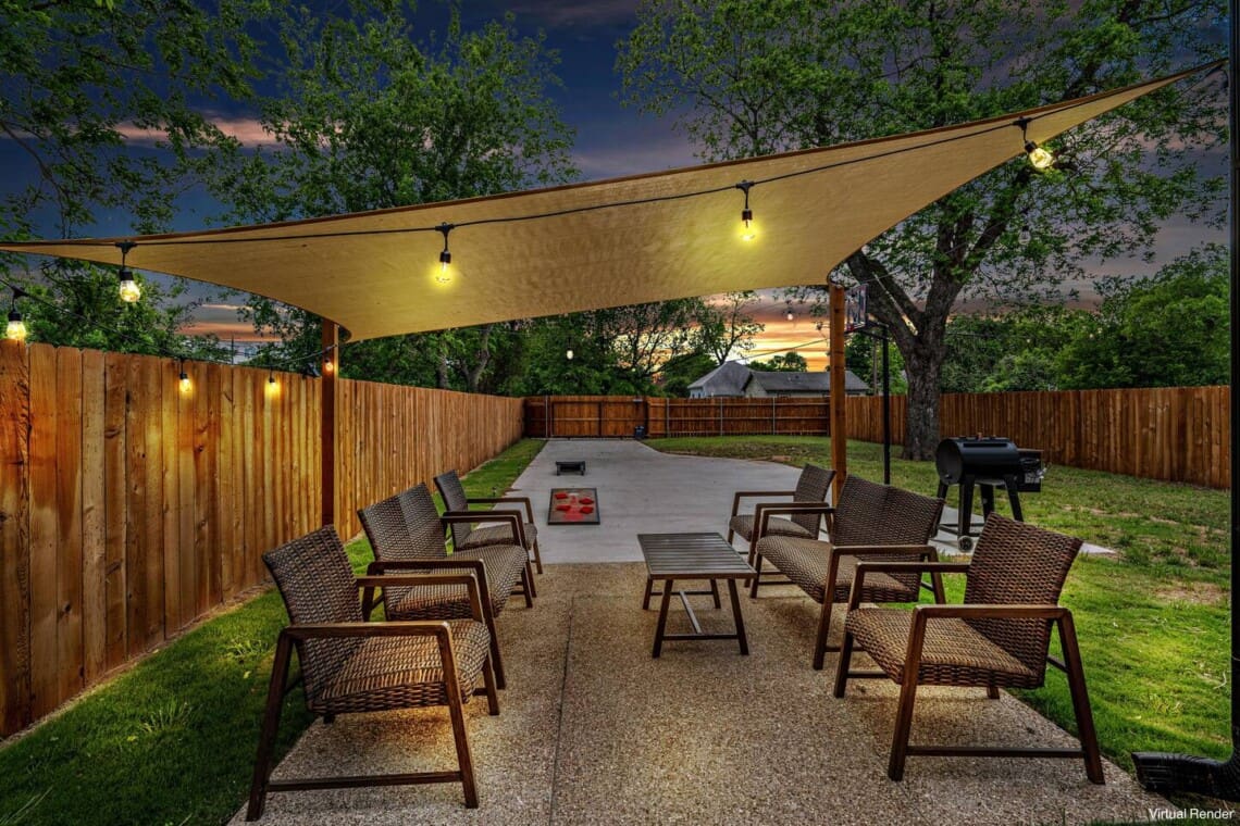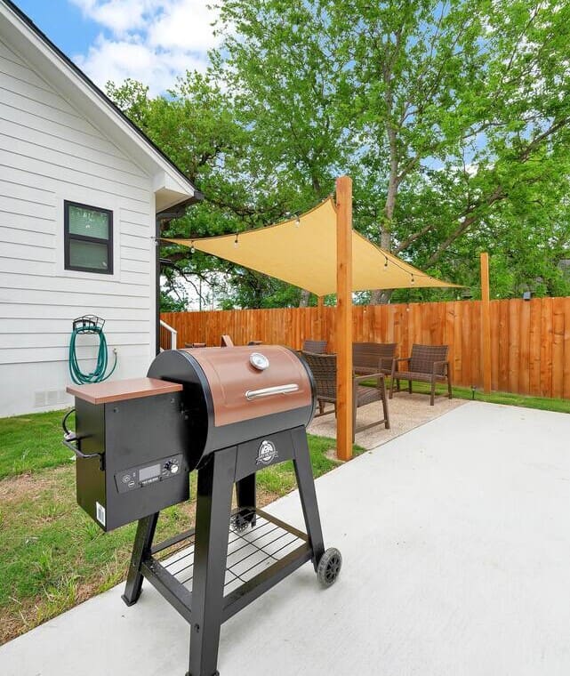 We have outdoor furniture and lighting in the backyard as well as a pellet grill and basketball goal. Please provide your own pellets.