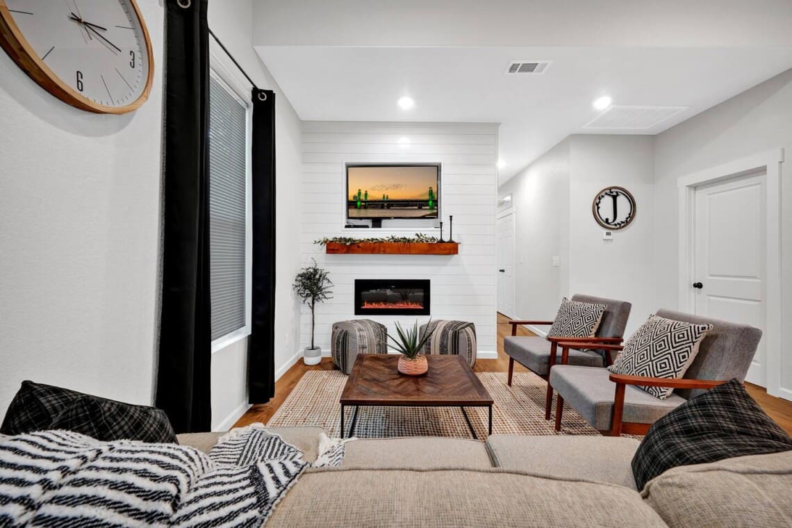 Fire place is electric and provides great ambience.