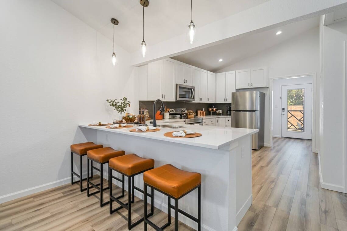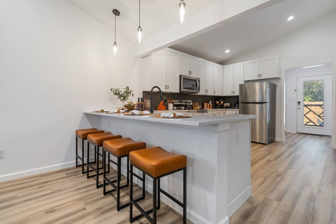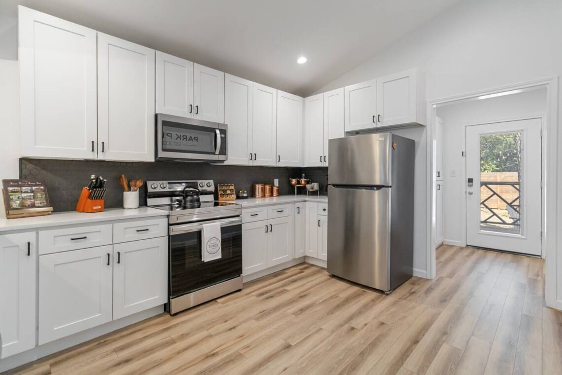 The kitchen has everything you need to cook and enjoy a meal at home (but we recommend you try some of Bastrop’s great dining and music venues). Plenty of seating for dining at the Dining Table and bar seating.