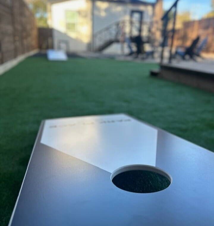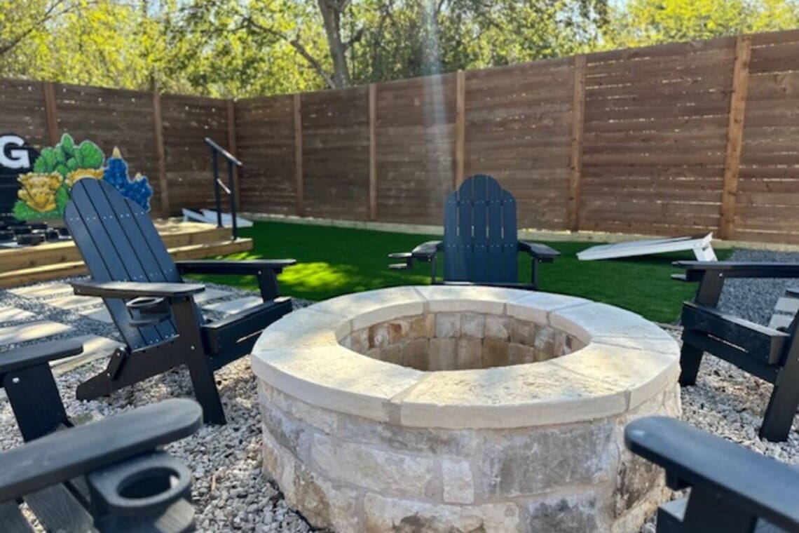 The backyard features a firepit with five Adirondack chairs, a back deck to enjoy outdoor games such as Jenga, checkers and connect four as well as a custom set of cornhole boards.