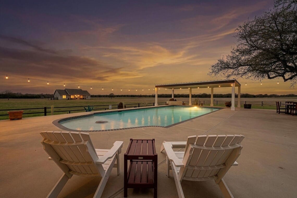 New Listing! Escape to the wide Texas sky and peaceful country living at this spacious private estate just outside Waco. Spend your days lounging by the water, playing yard games, or challenging friends to a game of pool, then wind down under the stars. Whether you’re sipping coffee while watching the sunrise over the countryside or gathering with loved ones after a day of exploring Waco, this property is designed to create unforgettable moments and a truly relaxing getaway. The main house welcomes you with a large, open kitchen that’s fully equipped for preparing meals together, plus plenty of space to gather around the table after a day of exploring. With three comfortable bedrooms and two and a half bathrooms, the home offers plenty of room for everyone to spread out. Enjoy spa-like bathrooms with walk-in showers and a deep soaking tub—perfect for unwinding after a day in the sun. Families will love the children’s loft hangout, while the shelves of puzzles and board games provide entertainment for all ages.