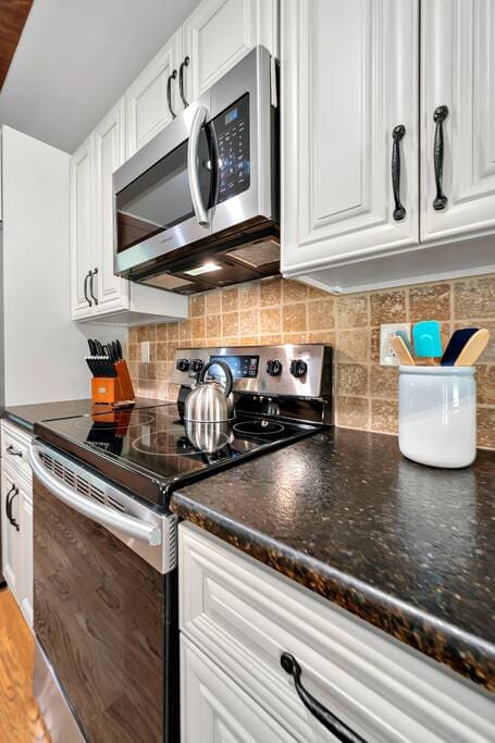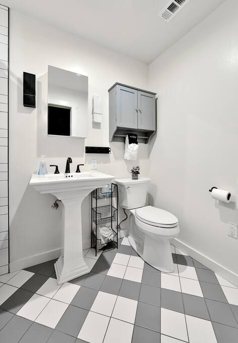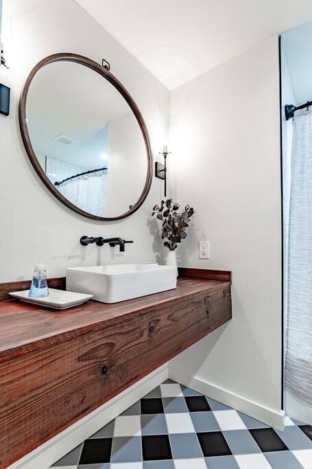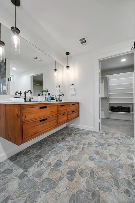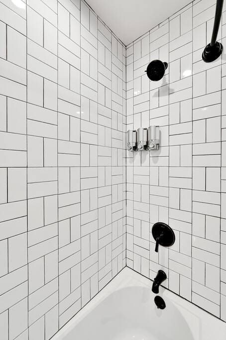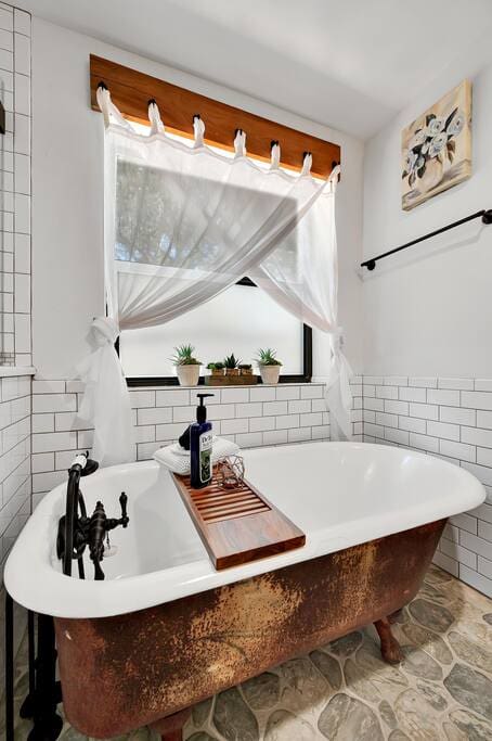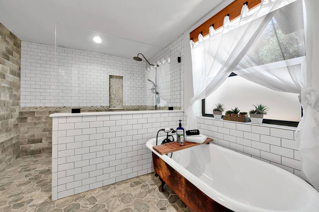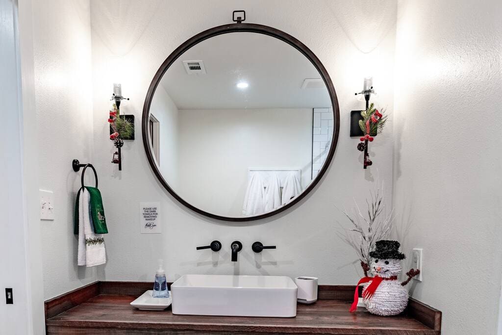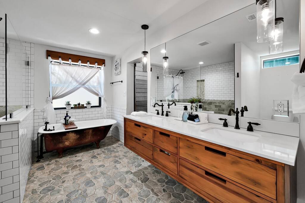 The large master bedroom features a king size bed, 55″ HD Smart TV, office desk with comfortable chair and access to the backyard. The master bath is the icing on the cake with a large walk in shower, a clawfoot bathtub and bathroom vanity with double sinks.