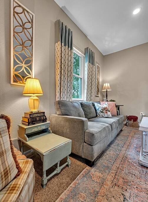 Open-concept living room with Smart TV and streaming access with individual guest log in