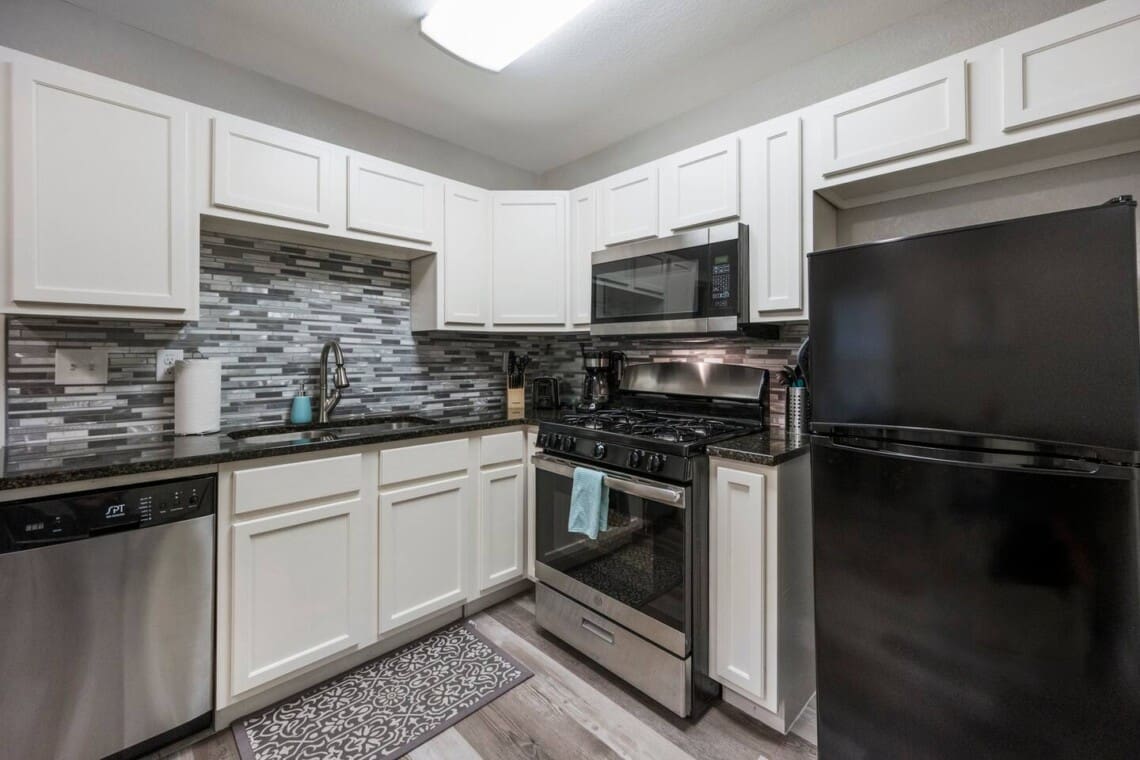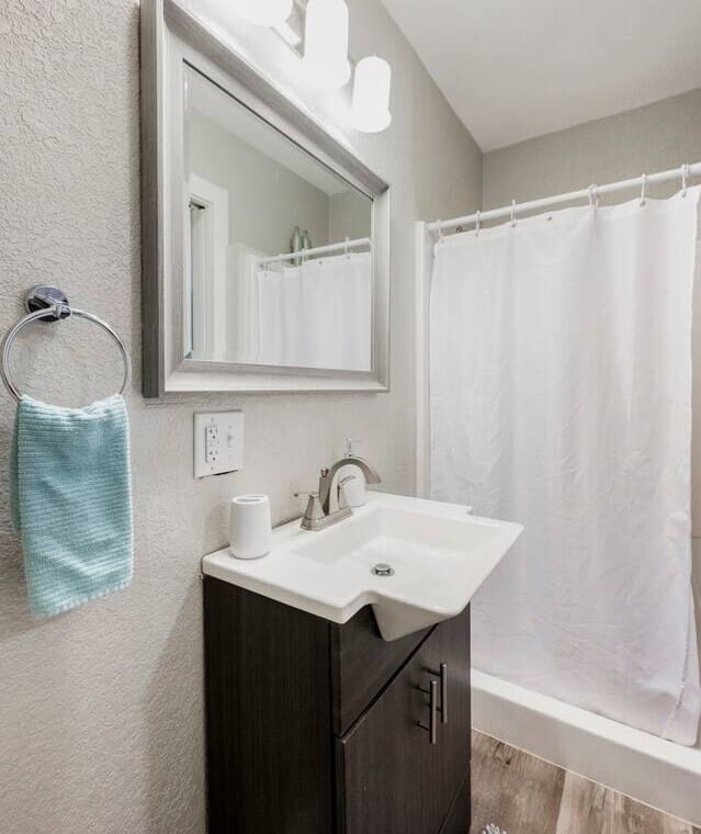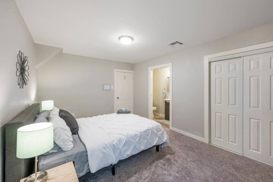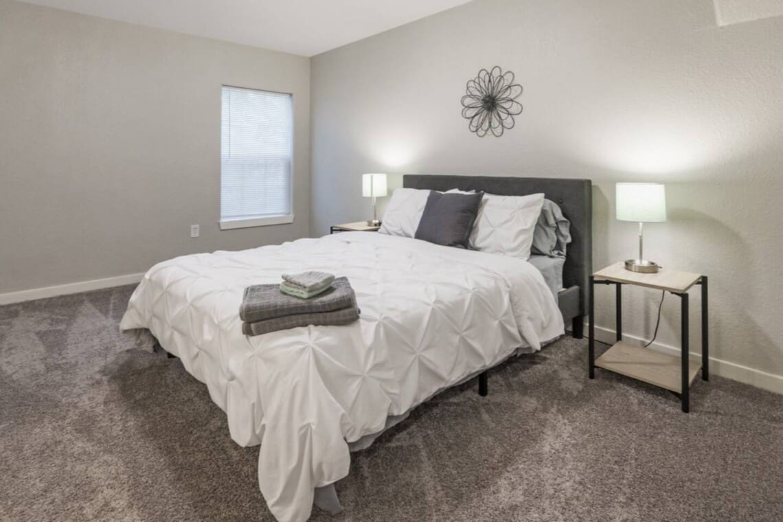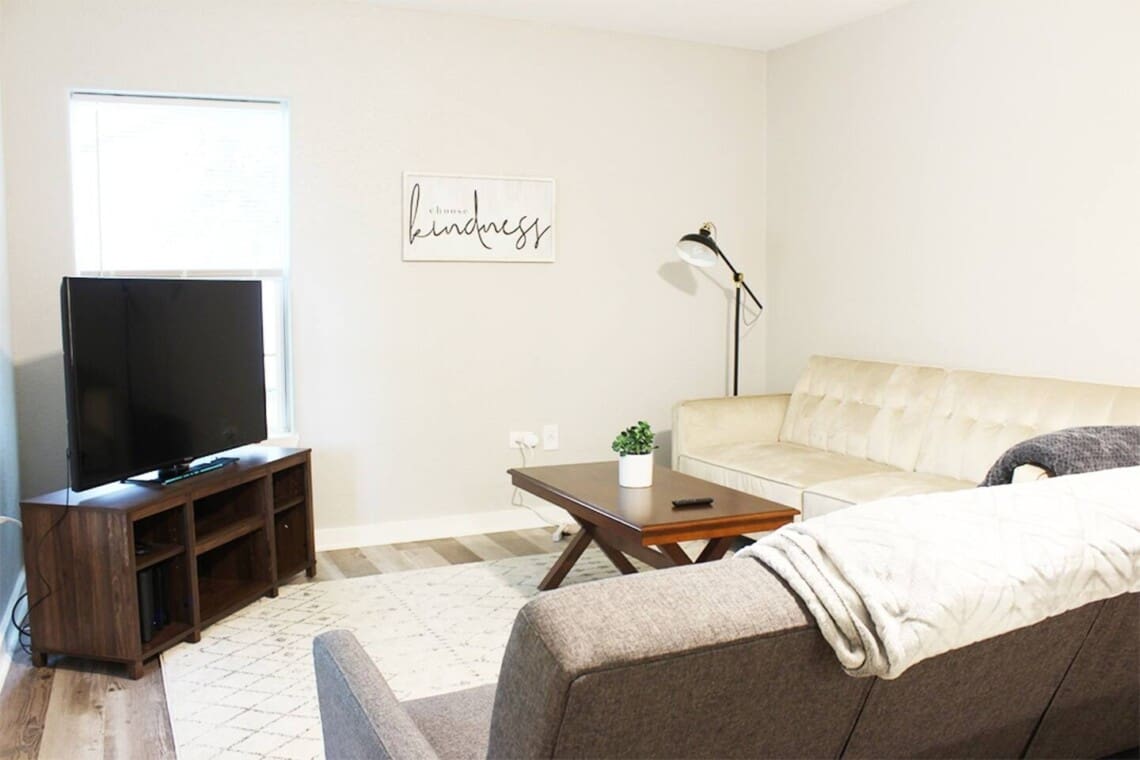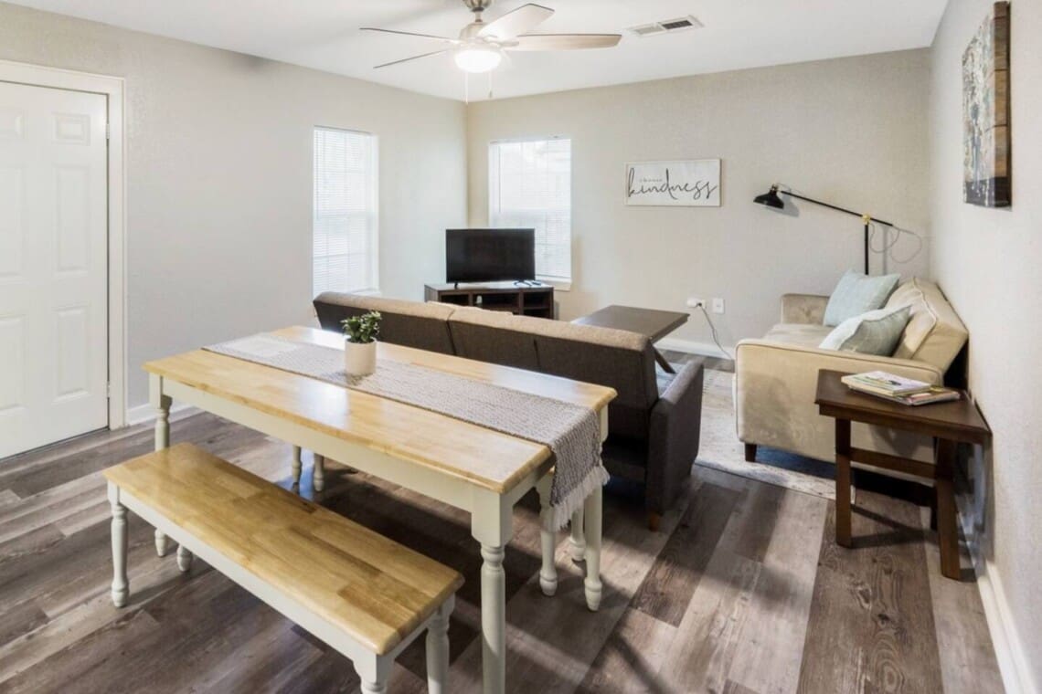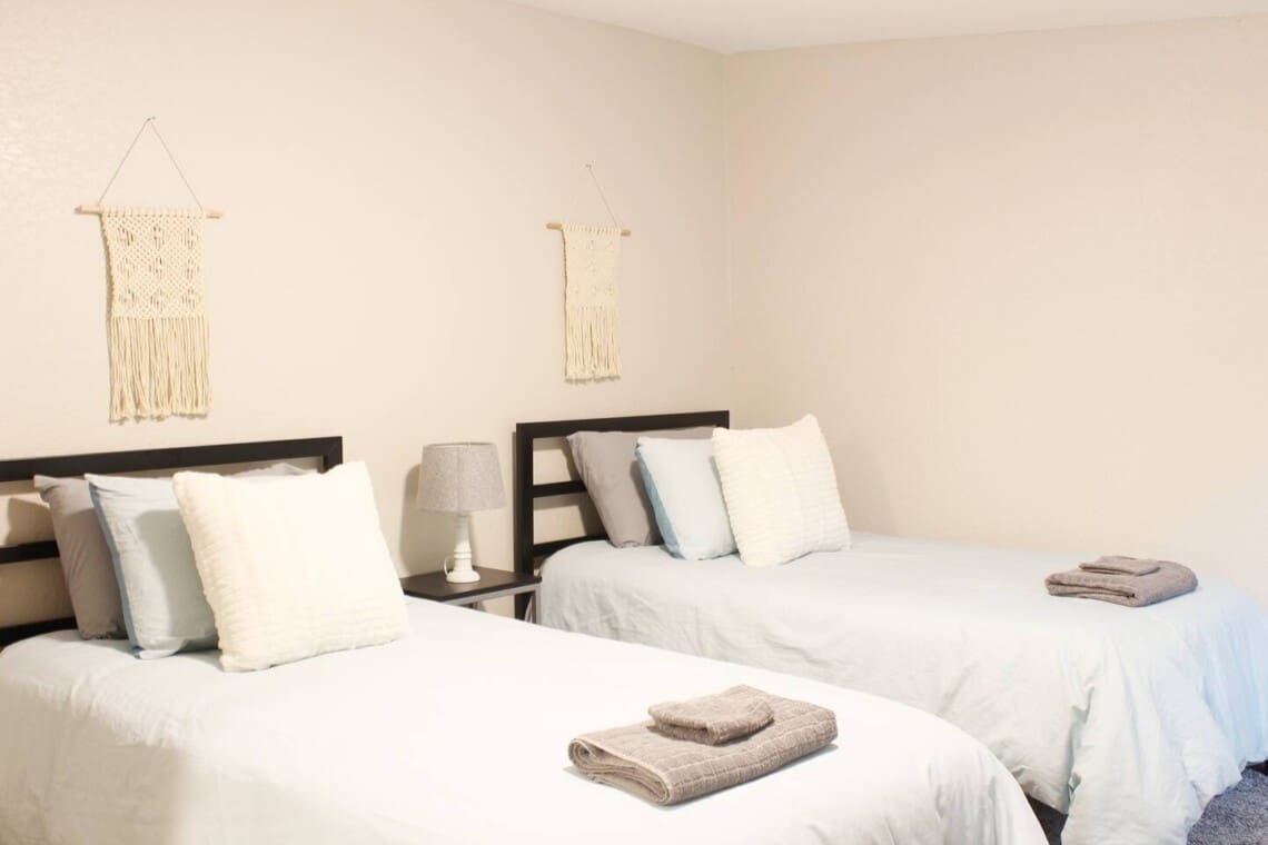 1,341 sq ft minimalist but stylish 3 bedroom 2 bathroom home perfect for both small and larger groups. If any extra sleeping space is needed, the two couches in the living room fold down to beds and an air mattress is provided. The full kitchen is stocked with all the essentials but please note, there is no ice maker.