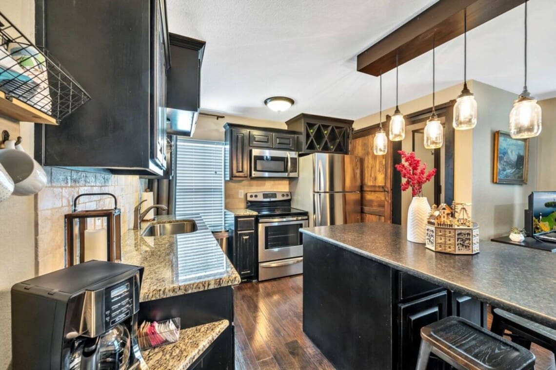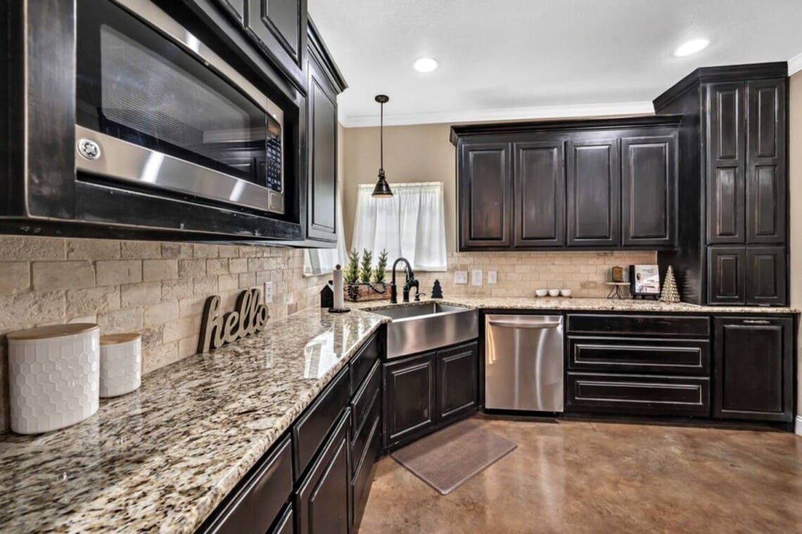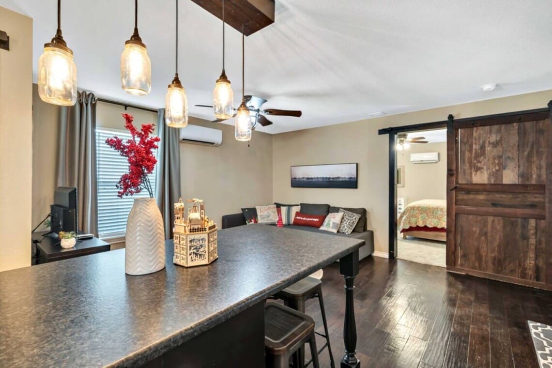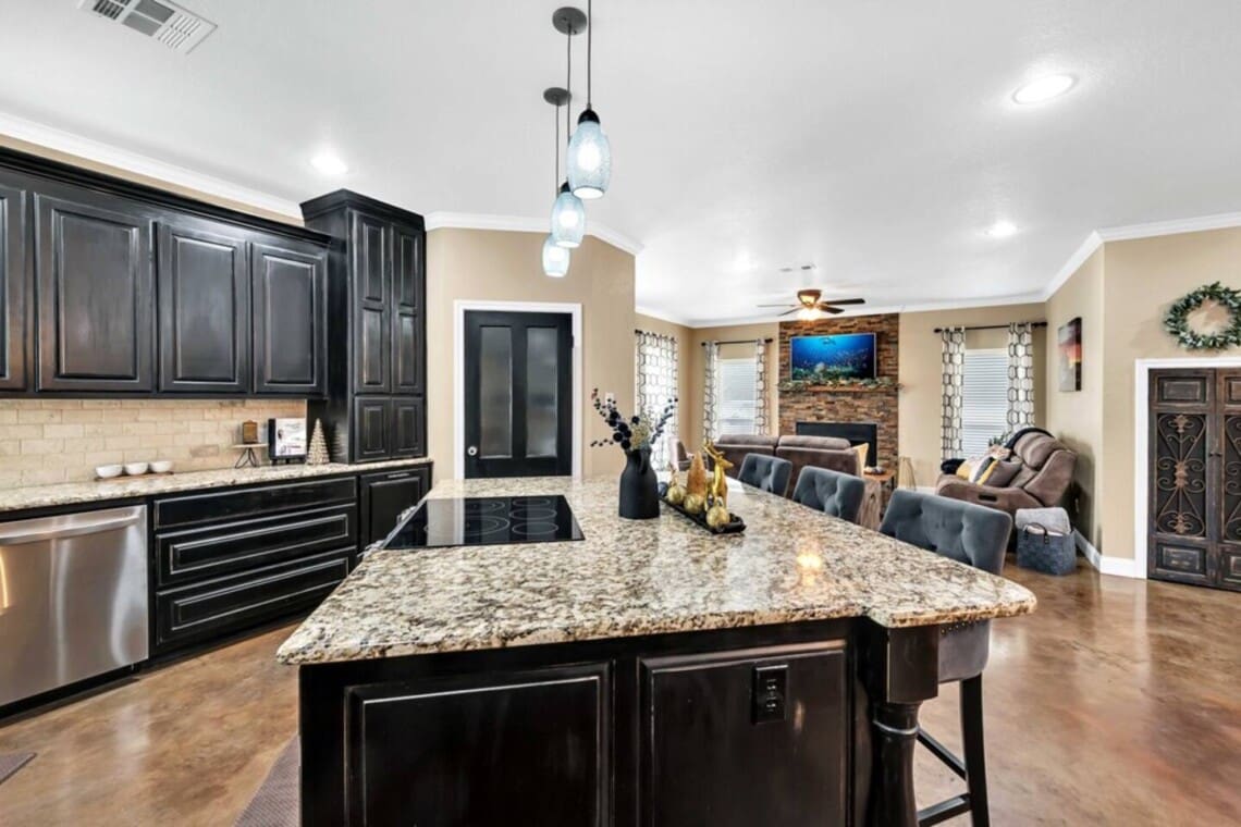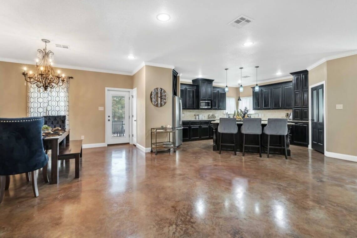 The main house is spectacular! The cement floors and granite countertop perfectly match for a stunning downstairs area. The extra-large bar allows for plenty of setting or places to place large amounts of food for family gatherings. The upstairs contains a private reading/game area and three bedrooms.