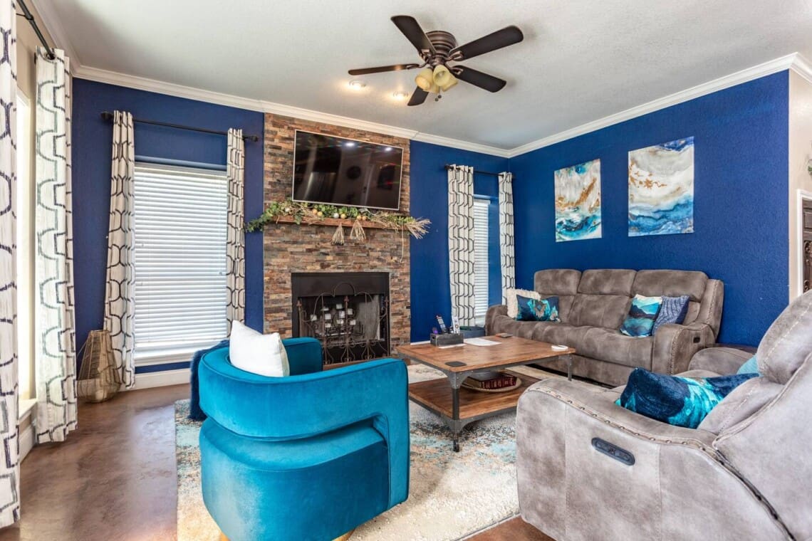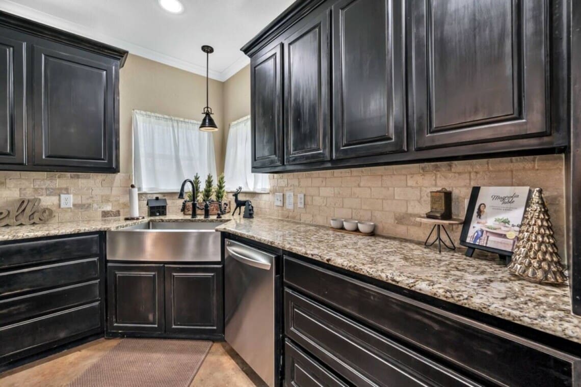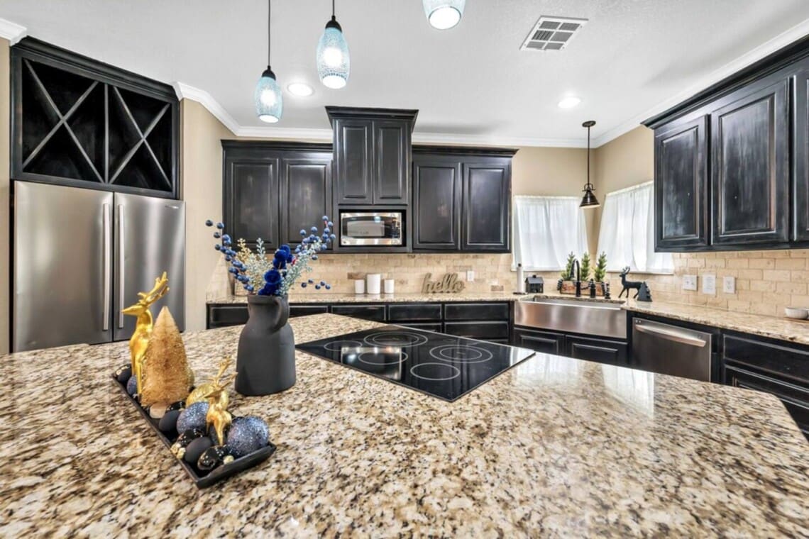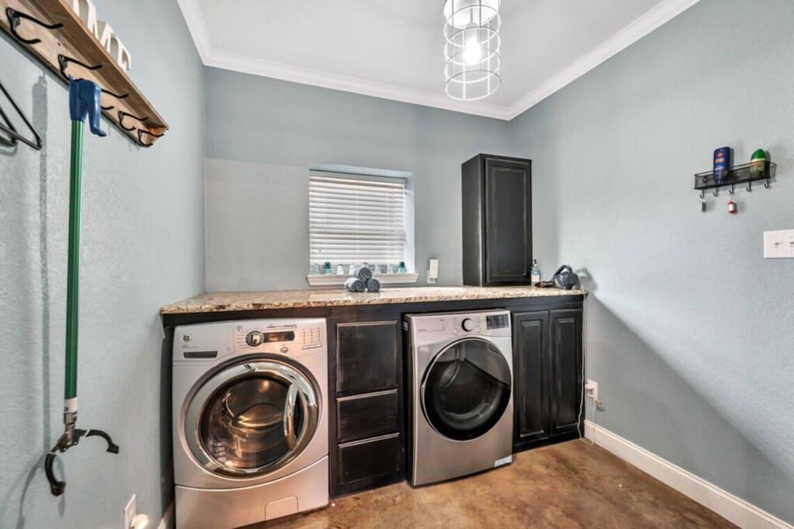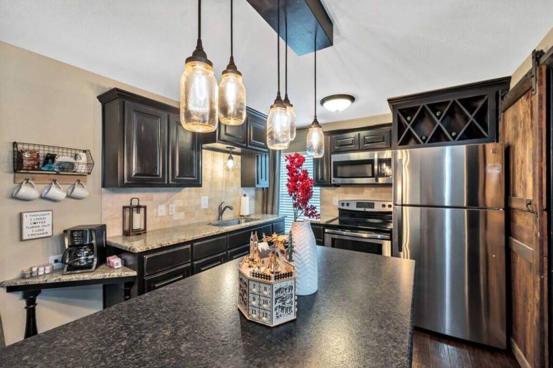 The main house is spectacular! The cement floors and granite countertop perfectly match for a stunning downstairs area. The extra-large bar allows for plenty of setting or places to place large amounts of food for family gatherings. The upstairs contains a private reading/game area and three bedrooms.