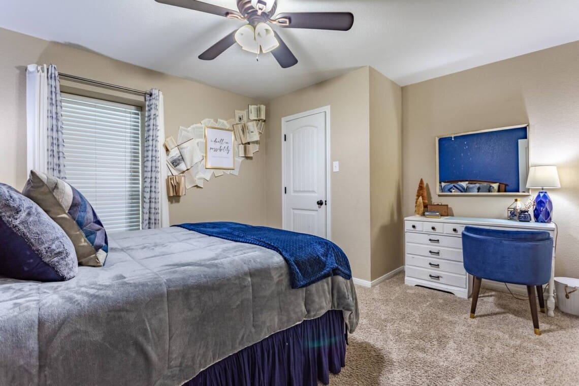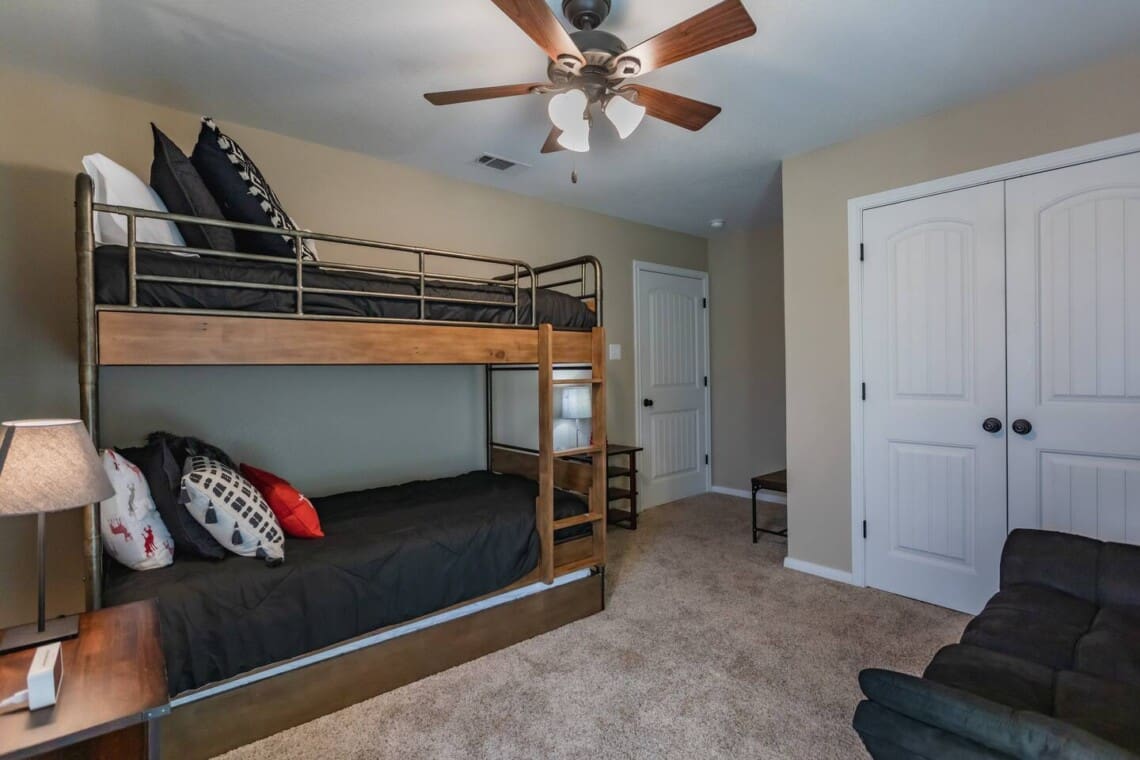 The master bedroom is upstairs and contains 1 queen bed, a small office, large closet, dual vanities and large shower. The 2nd bedroom upstairs contains 1 queen bed & the 3rd bedroom contains 1 set of single bunk beds with 1 trundle & 1 futon.