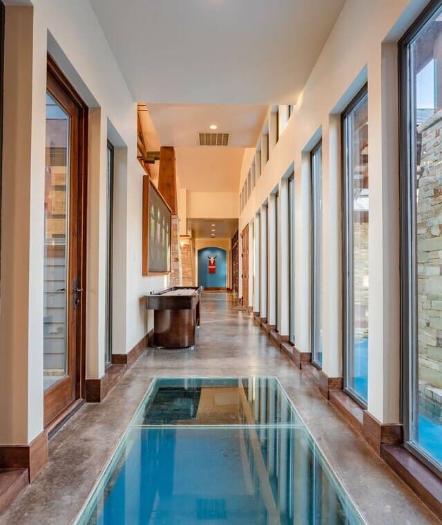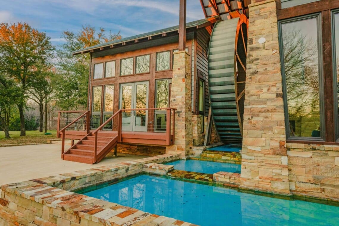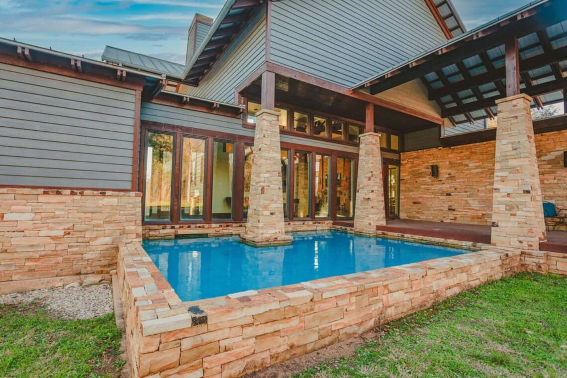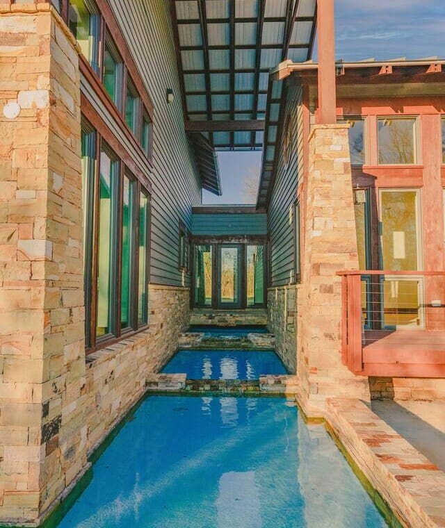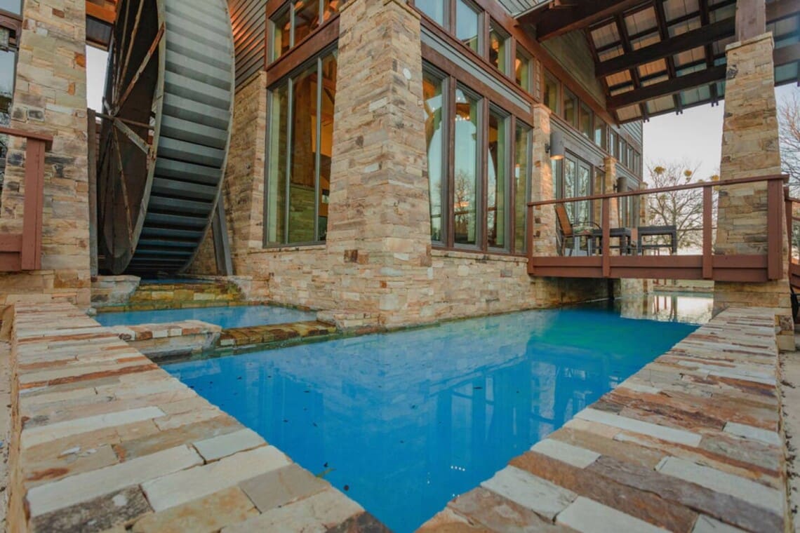 The water features surrounding the house are for aesthetic purposes and are only shin deep. Guests are welcome to sit in the water, but they are not made for swimming.